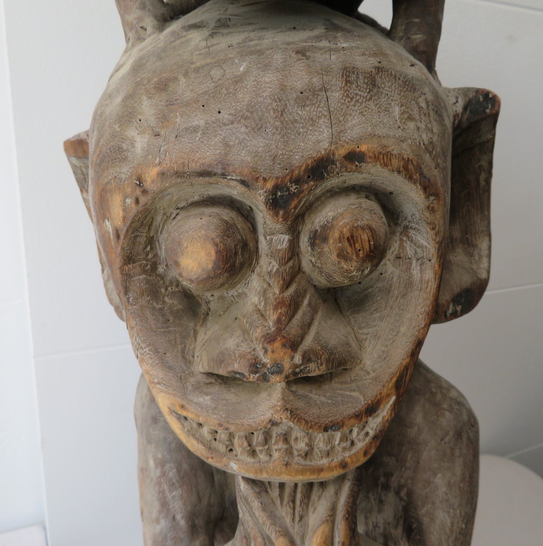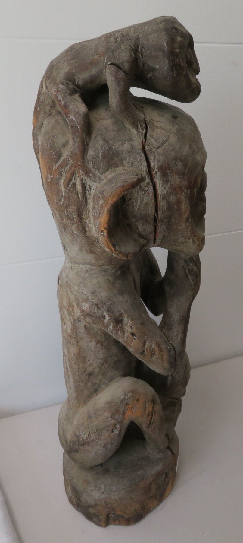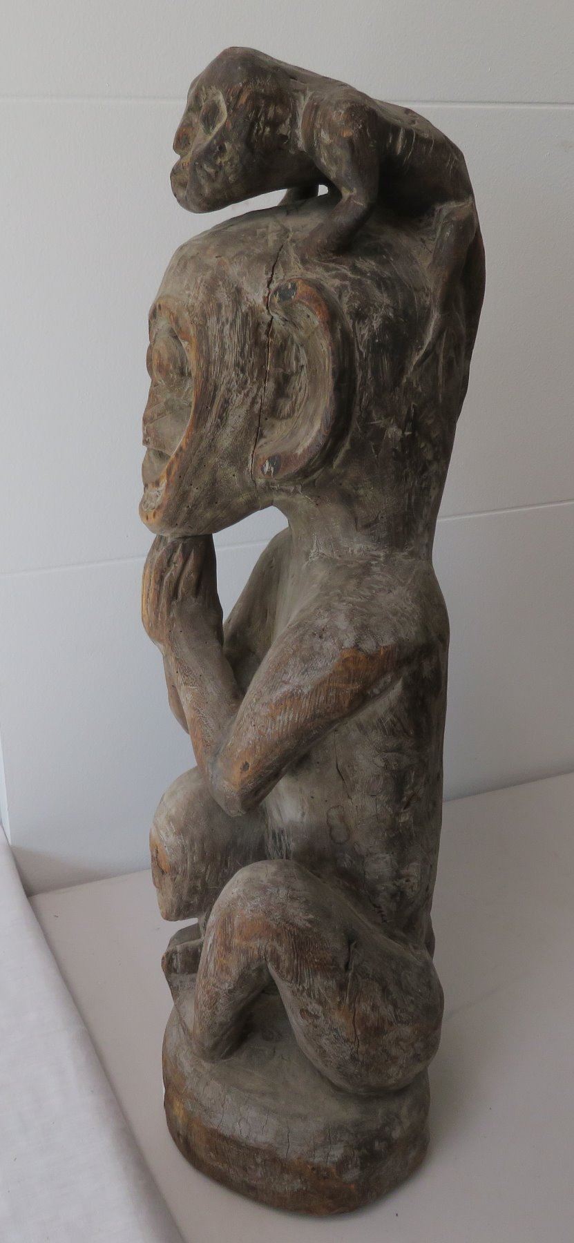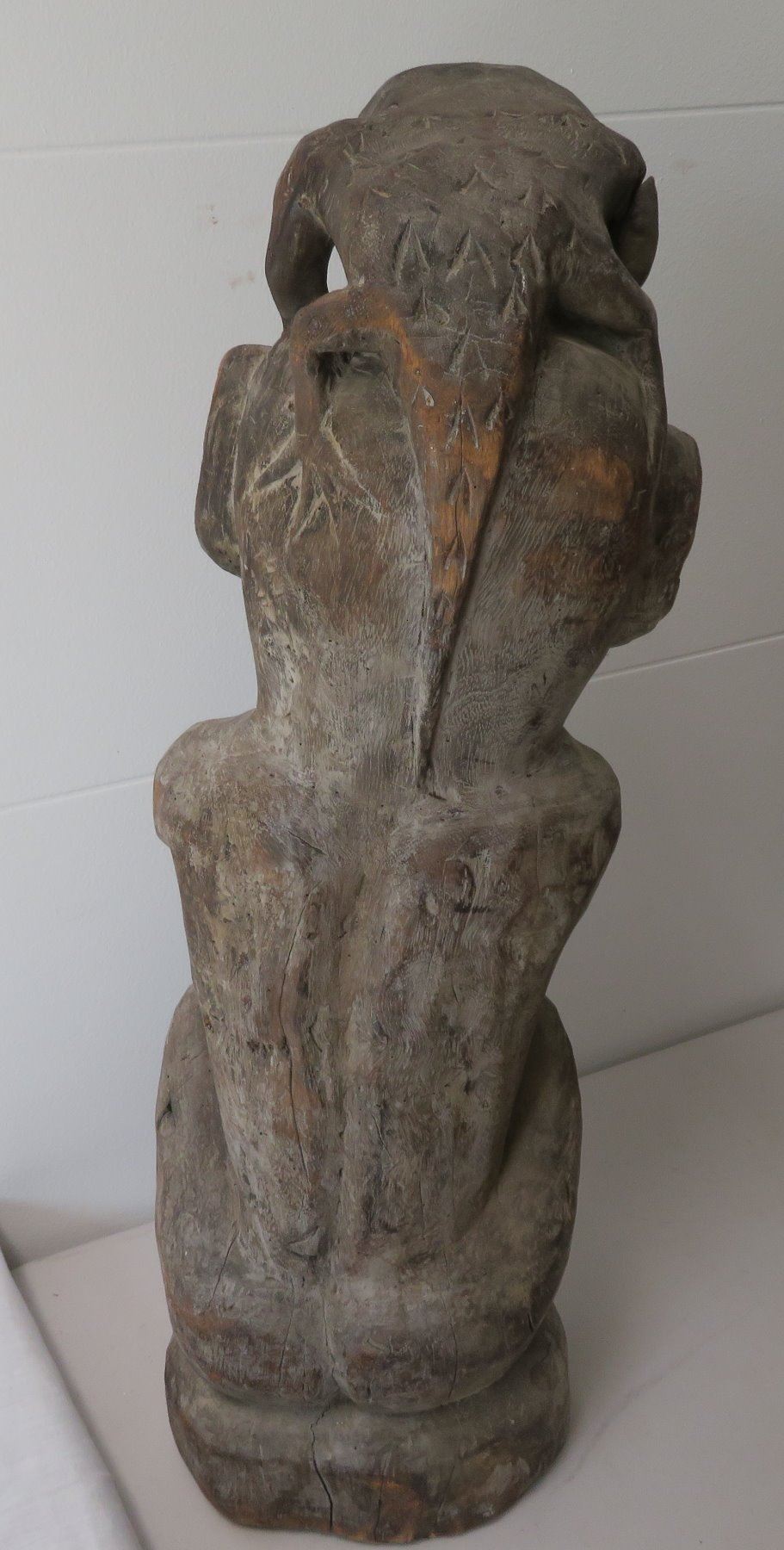 Early Indonesian Carving, c. 1900. Made of hardwood, the item measures 26" x 9" x 8". Dayak. Condition: Has a couple cracks, see images. Shipping: $80.00 USA estimate only, due to heavy weight, size and value, insured w/signature.
