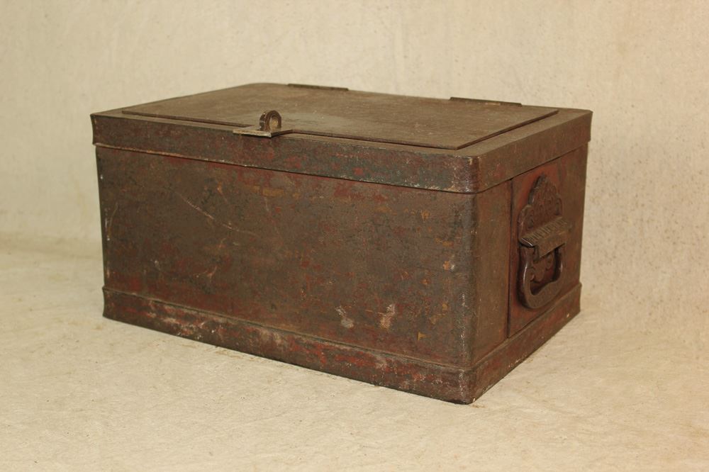 Stagecoach style strongbox with heavy iron lid made for large padlock, and decorative cast handles. Measures 13" wide.