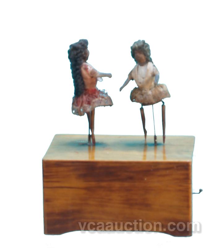 Early Ives Style Wooden Music Box, w/ 2 dancing girls and plays 2 different tunes