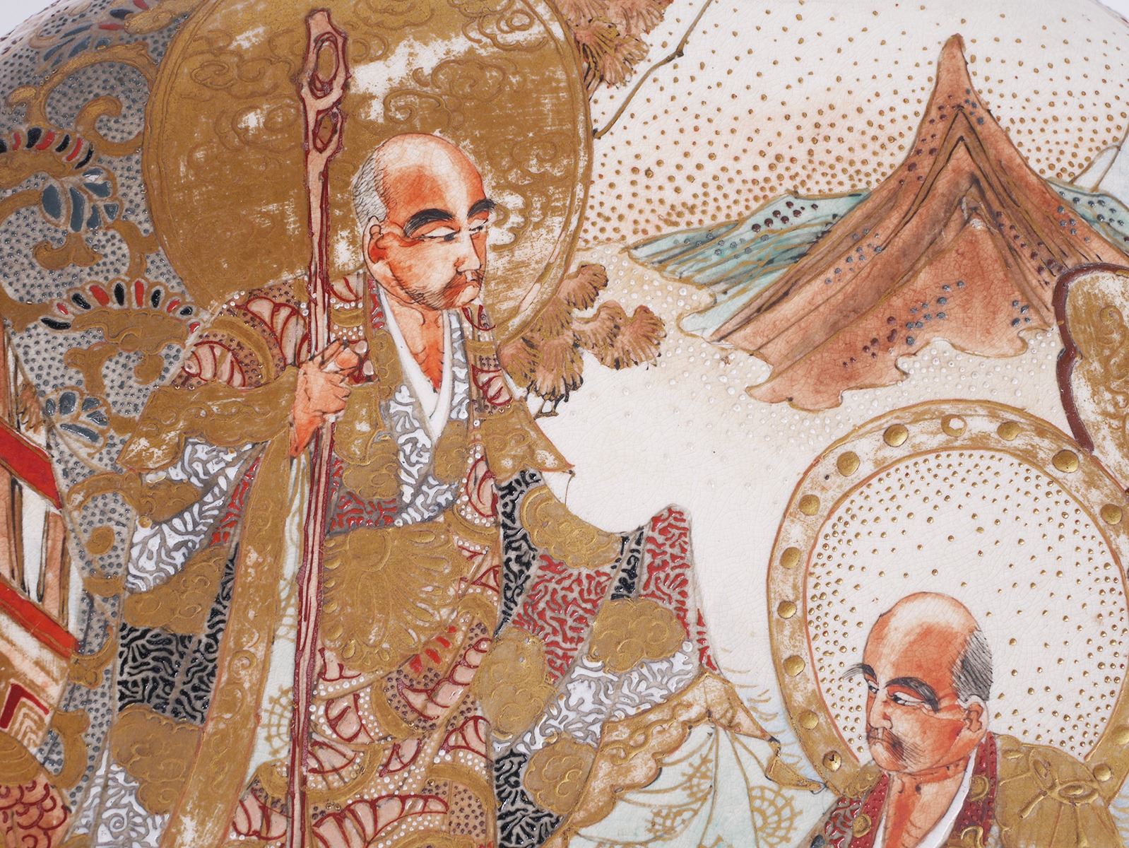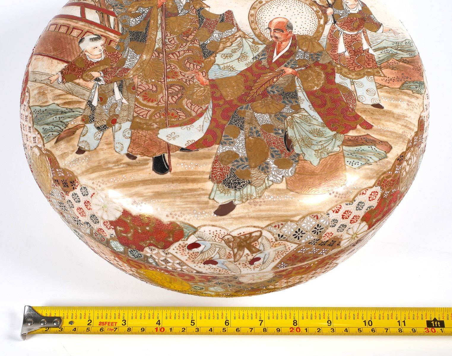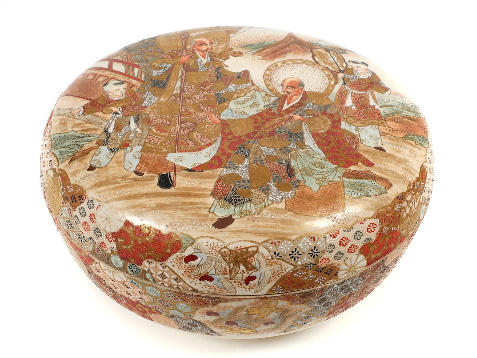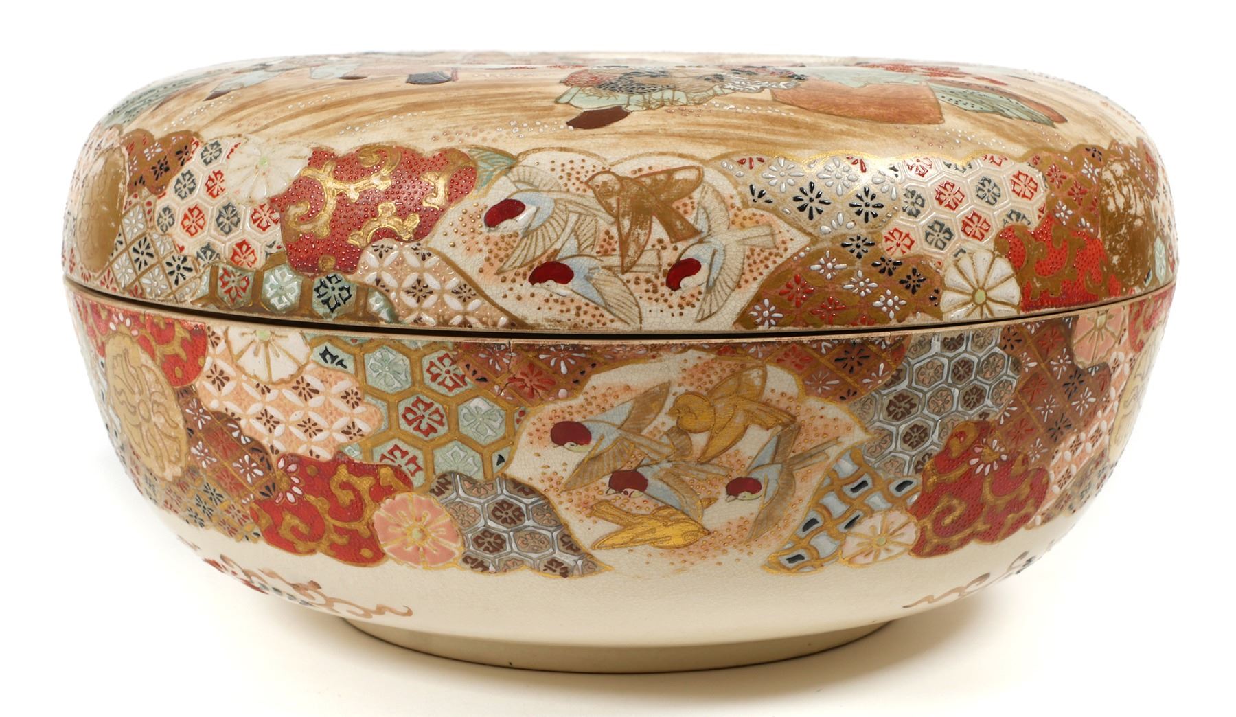Massive, 12-1/8" wide round box, unsigned -- early Meiji or Edo era Satsuma. Decorated on top of lid, sides, inside bowl and on underside of lid. Typical crazing with some underglaze spotting, a short (1") surface hairline along inside edge, and some minor gilt wear. Very fine condition else. From estate collection of very fine Satsuma, several pieces of which are in today's sale.