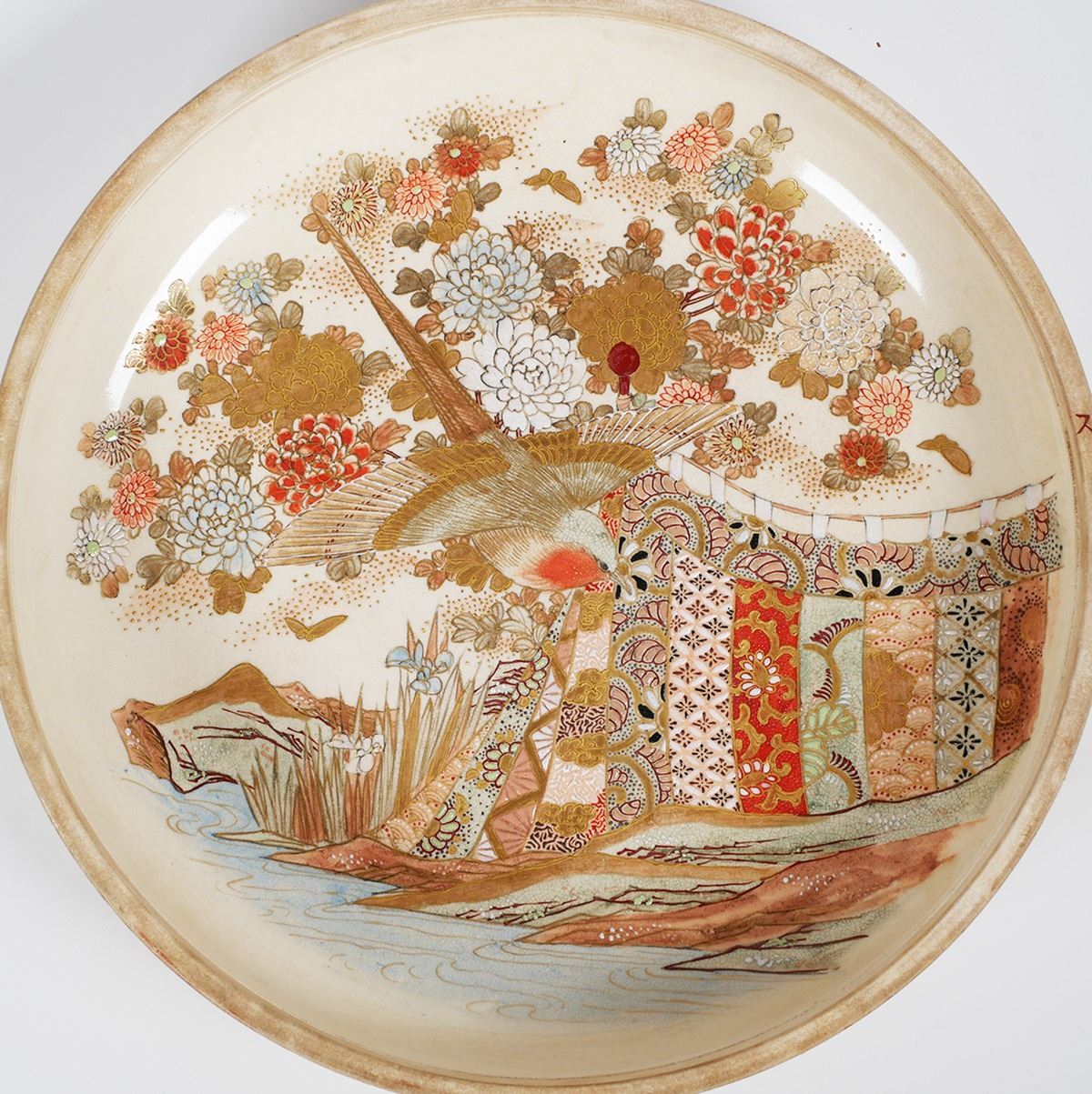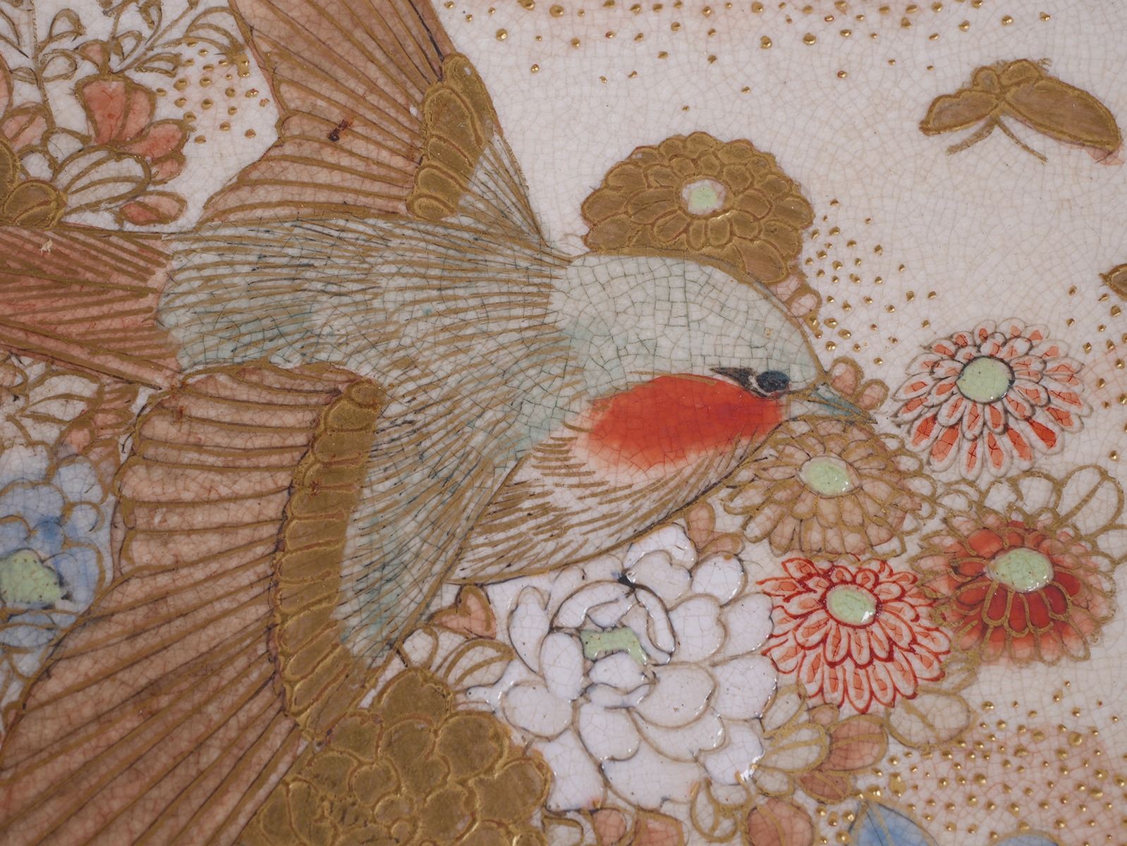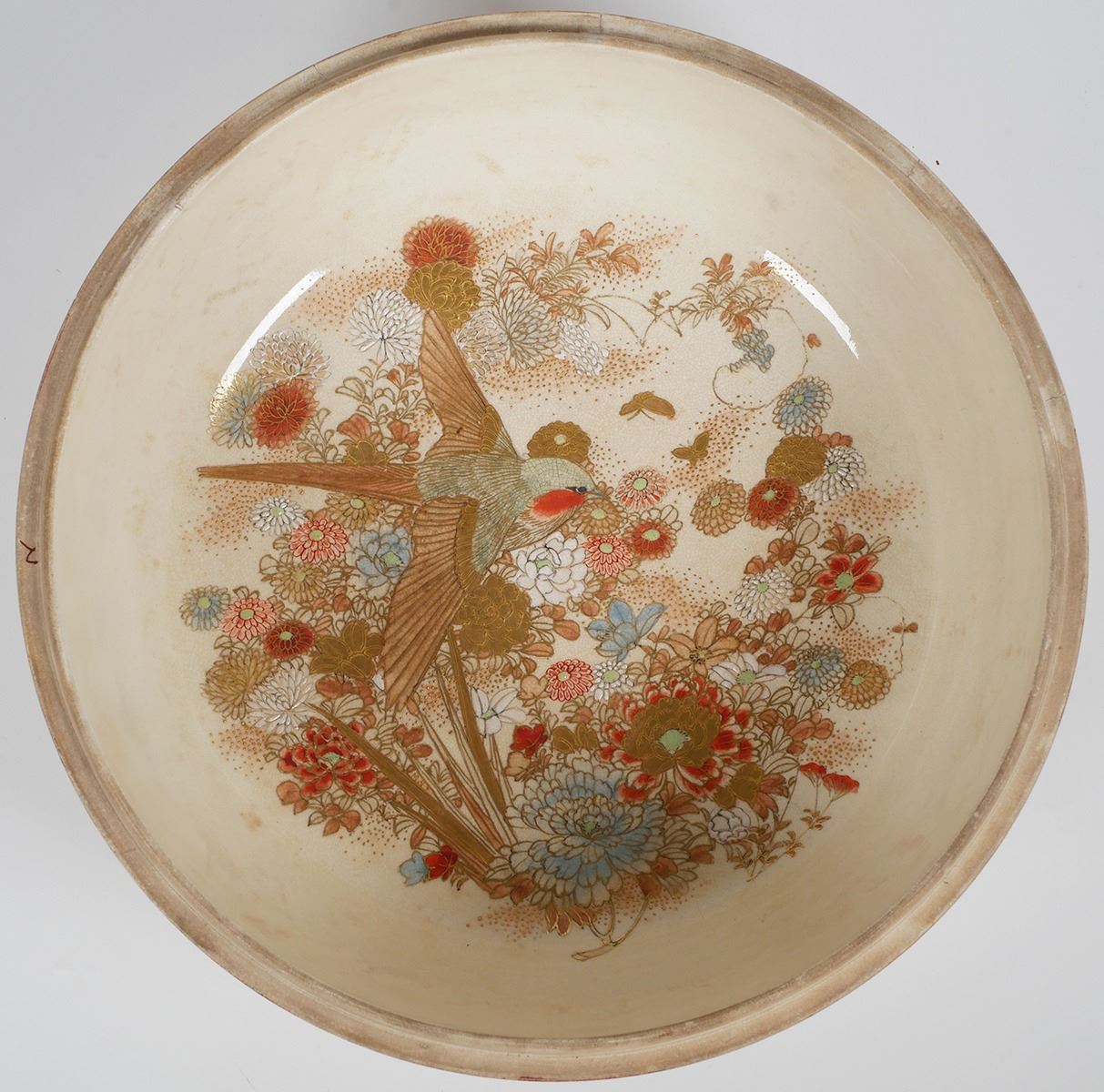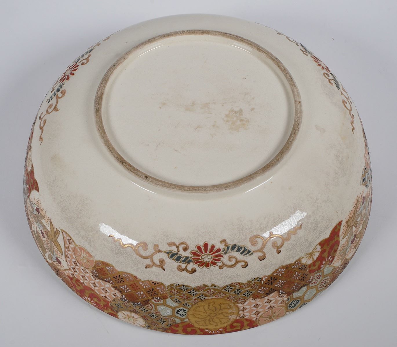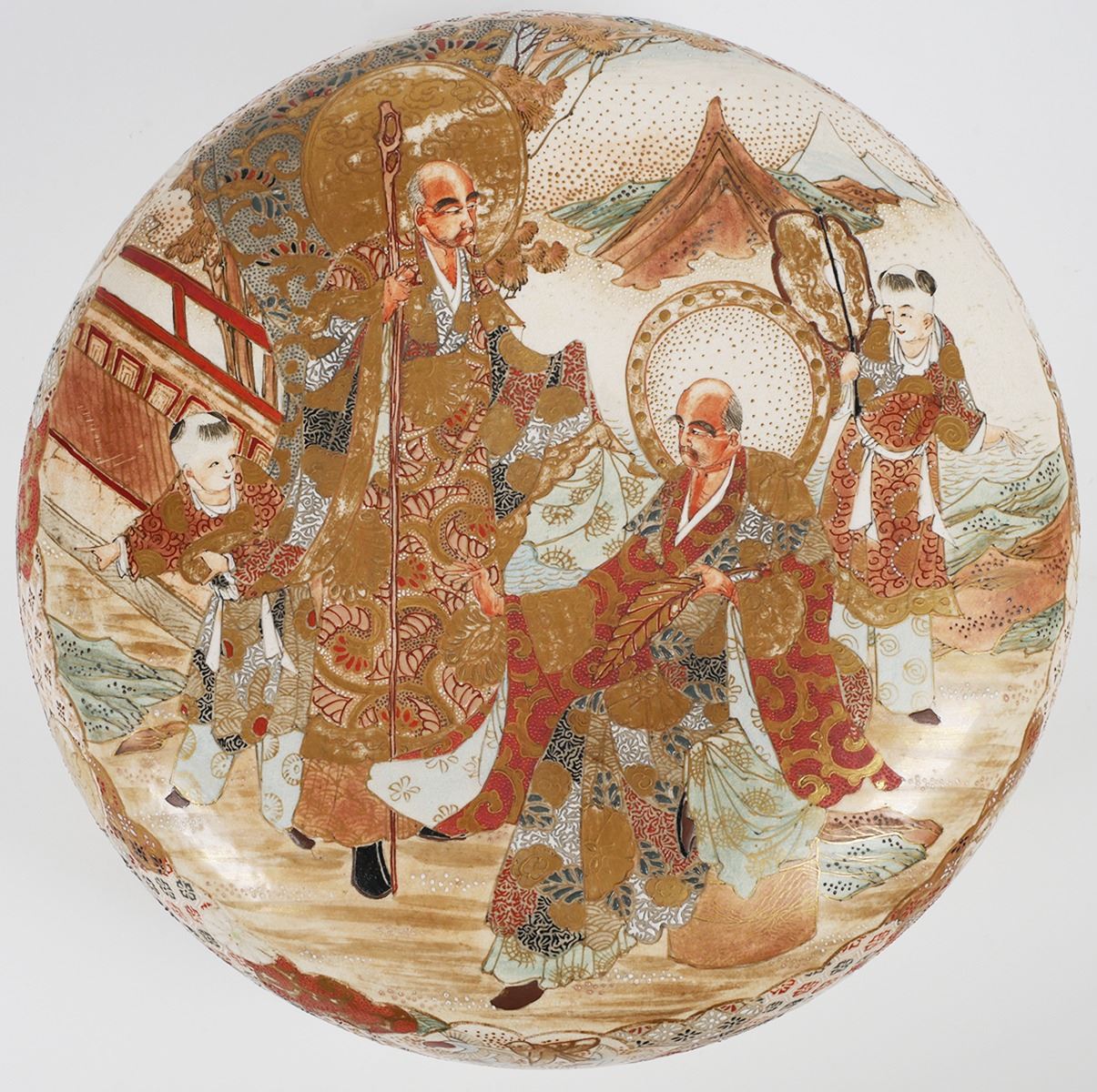 Massive, 12-1/8" wide round box, unsigned -- early Meiji or Edo era Satsuma. Decorated on top of lid, sides, inside bowl and on underside of lid. Typical crazing with some underglaze spotting, a short (1") surface hairline along inside edge, and some minor gilt wear. Very fine condition else. From estate collection of very fine Satsuma, several pieces of which are in today's sale.