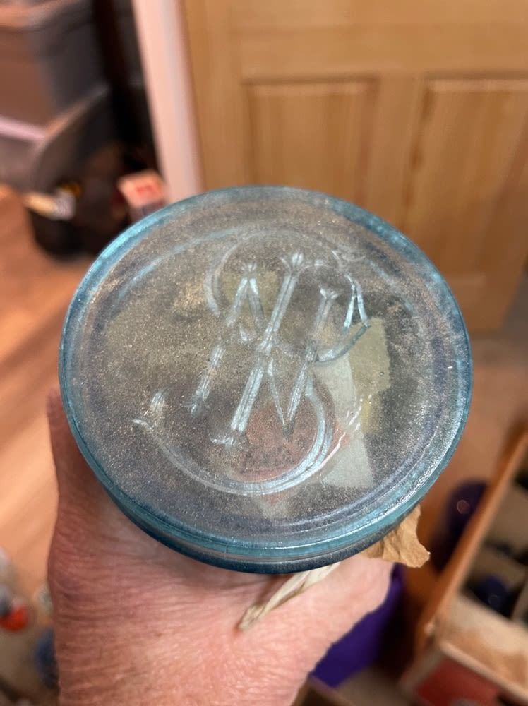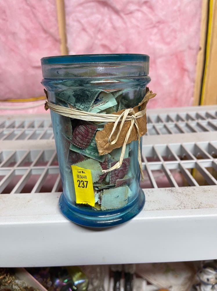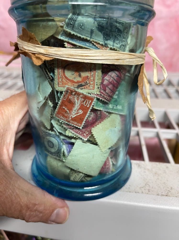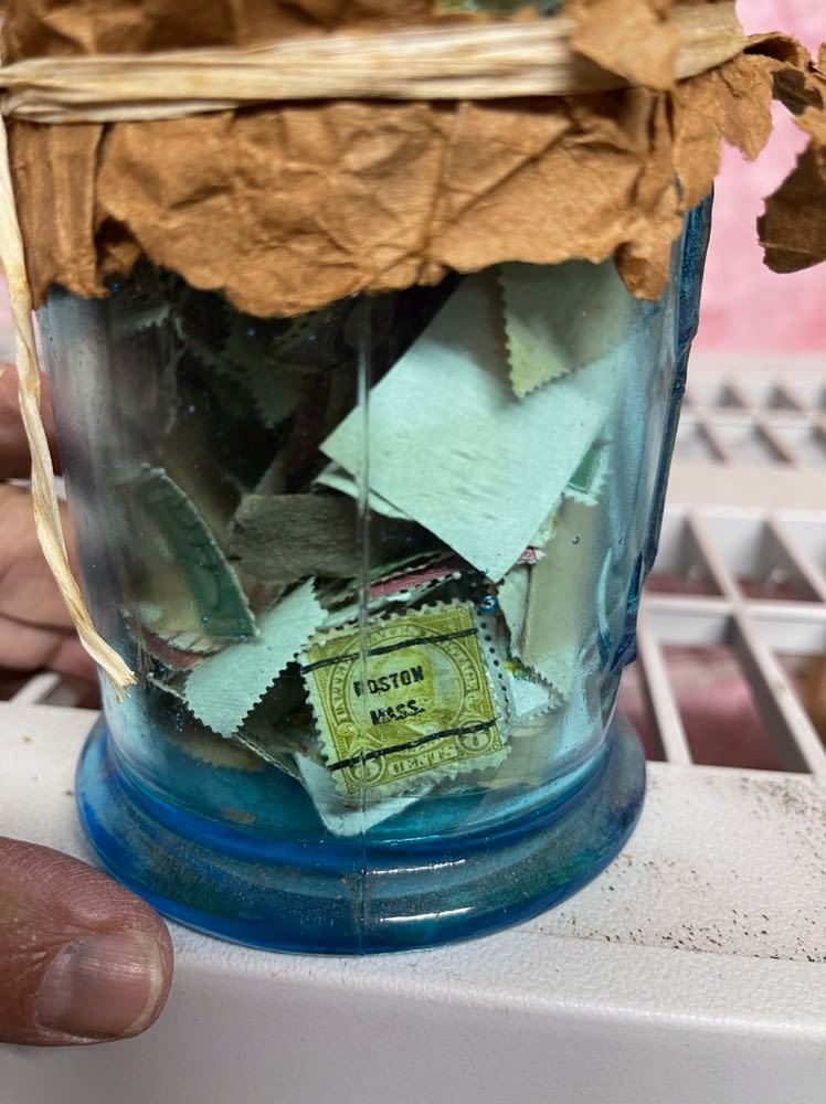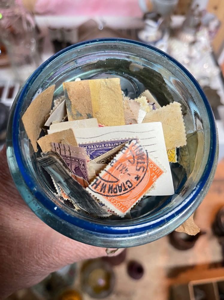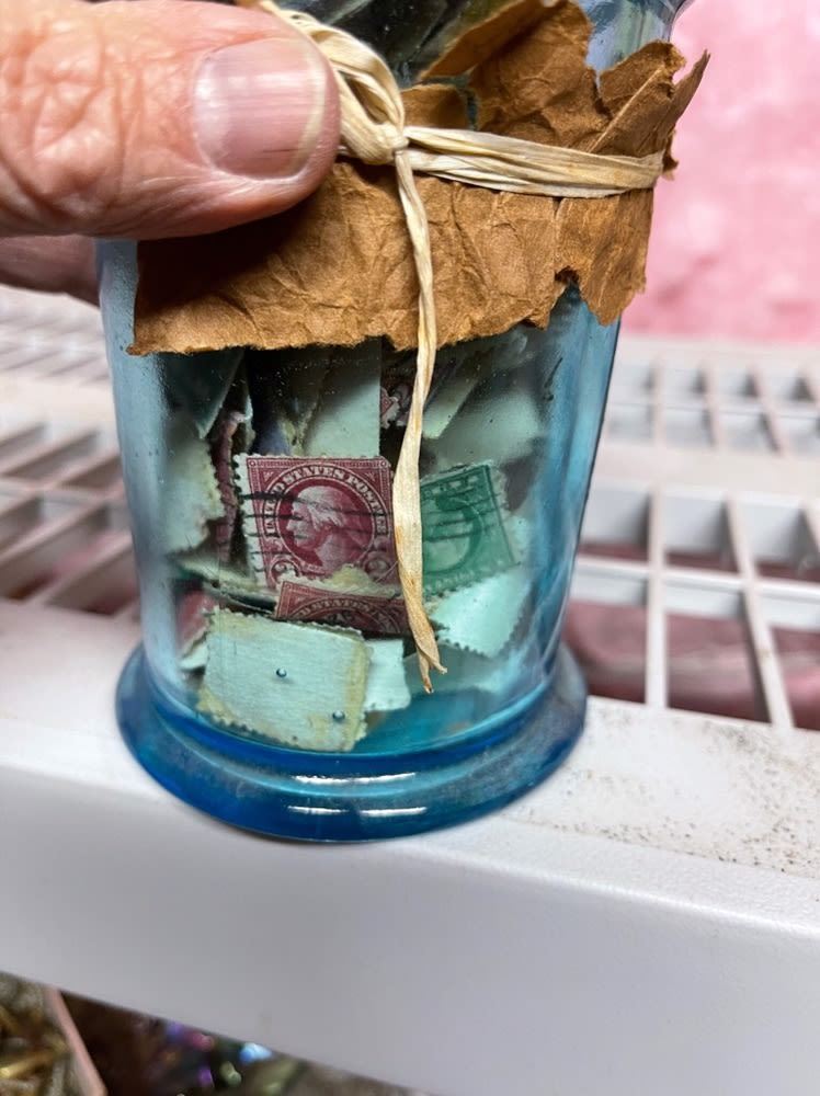 Early blue glass jar with engraved monogram on lid filled with early stamps from the attic collection!