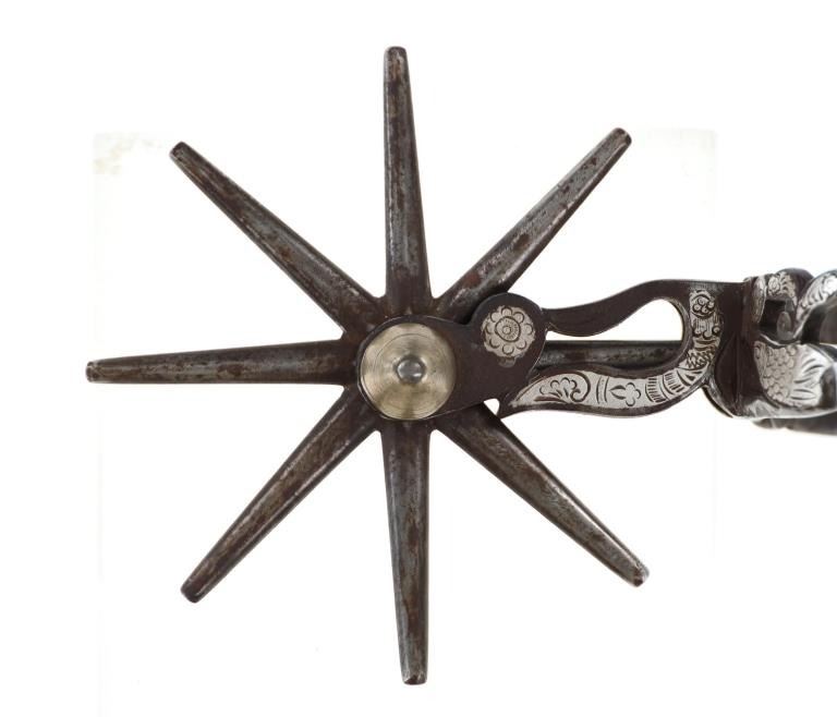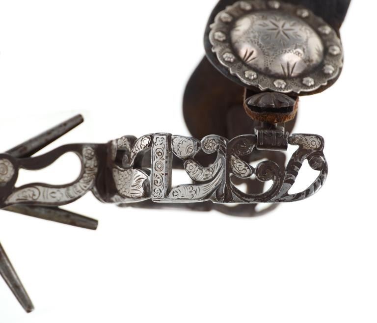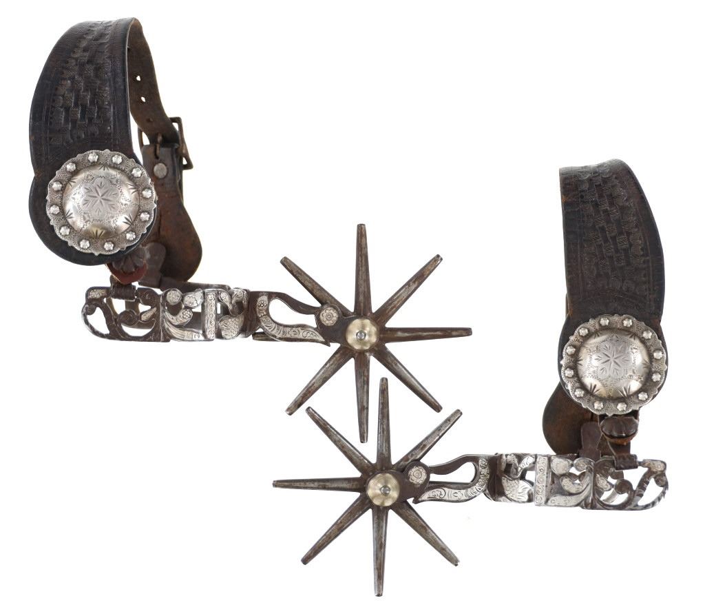 This is truly a stunning set showing double silver mounting (silver inlay and overlay on both sides), filigree cutouts along the entire spur include both side and both sides of the shank, the raised nipple concho at the rowel spot, the stylized fish design and rooster designs with filigree floral designs. The set also shows two beautiful silver engraved 2-inch diameter heel band concho / conchas on the old leather spur straps with basket weave tooling. The set has 4 1/8-inch diameter eight / 8-point large rowels, total length with heel band is 12-inches and 6.5-inches wide with leather. Spur frame without strap spots is 3.25-inches wide.
