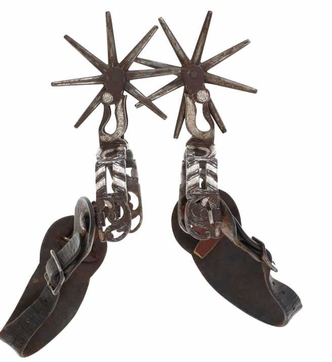 This is an original, authentic set of early Jesus M. Tapia (1856-1931) spurs with double silver mountings, engravings and filigree work. Jesus M. Tapia (1865-1931) is considered the Holy Grail of California spur makers with this set showing the distinctive design elements for authentic sets including classic engravings, intricate filigreed cut-out floral inlays with stylized rooster-head and fish design, all documented as being almost exclusively from Jesus M. Tapia.