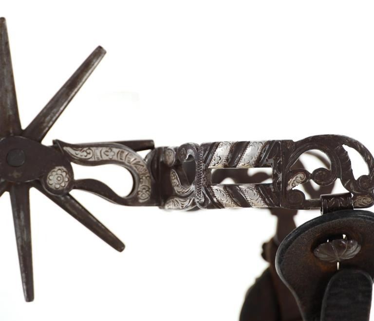 Jesus M. Tapia (1856 - 1931) spurs and bits are the most coveted and valued of the early California makers and was renowned for the elegance and grace of his pieces which frequently included very stylized iron work, tendrils and the elegant and artistry of filigree. Tapia’s work was seldom marked but his style and quality were so distinctive that a knowledgeable California spur and bit collector will have little trouble identifying the few pieces that come to the market. Tapia spurs are truly the most collected California maker with examples selling over $100,000 at auction. One of very few known Tapia’s with the filigree the raised nipple concho on the spur and raised nipple concho on the spur strap.