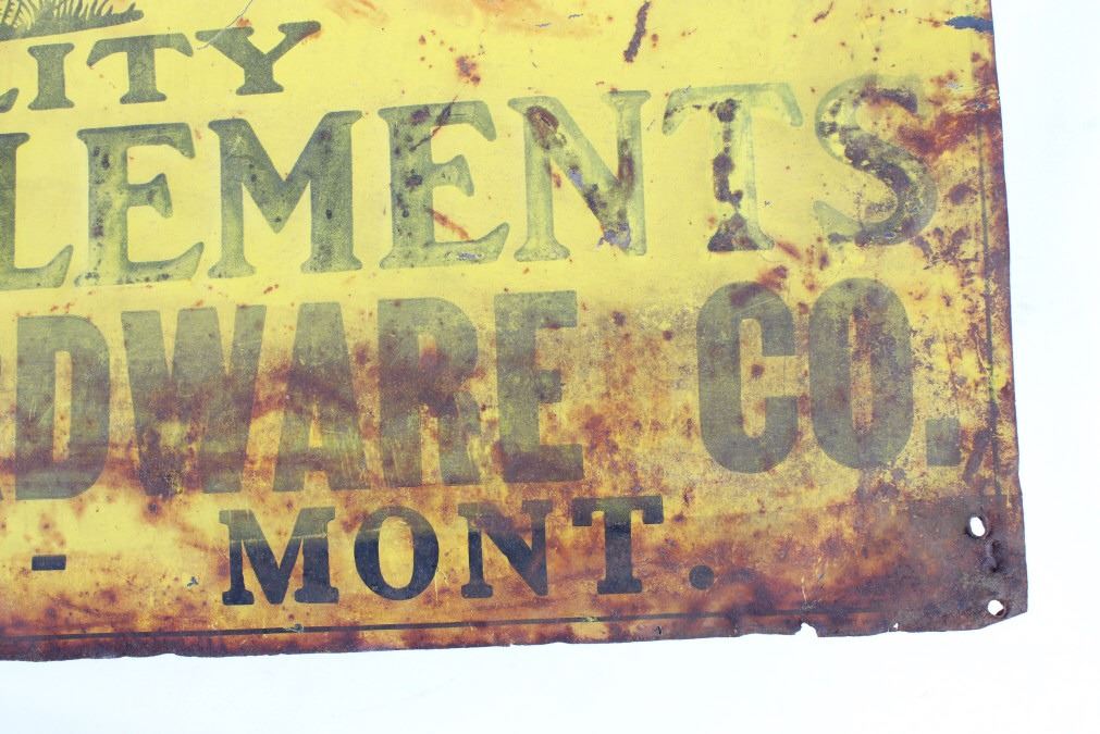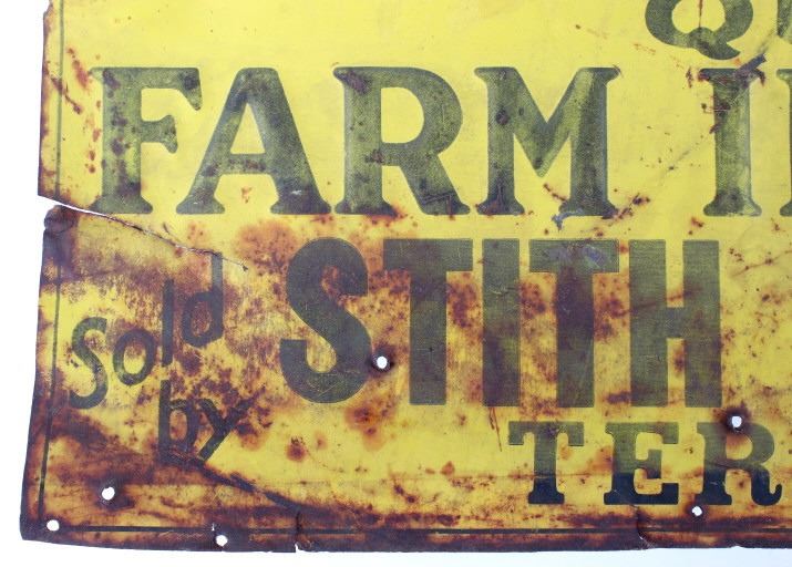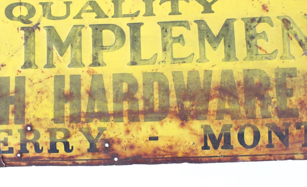 For your consideration is an early John Deere Quality Farm Implements embossed tin sign. This embossed sign features the second version of the John Deere trademark which was registered in 1912 but began use in 1910. This sign came out of Terry Montana from the Stith Hardware Co. The sign shows the original John Deere yellow and black font. The sign reads from top to bottom; "John Deere Quality - Farm Implements - Sold By - Stith Hardware Co. - Terry. MONT." The sign shows fair condition and a well worn patina. The sign measures 23 1/2" x 11 3/4".