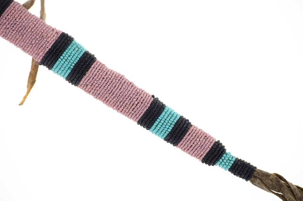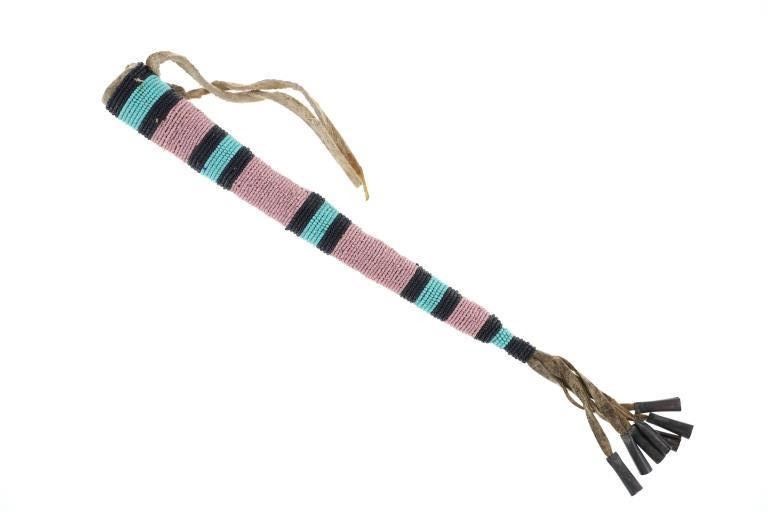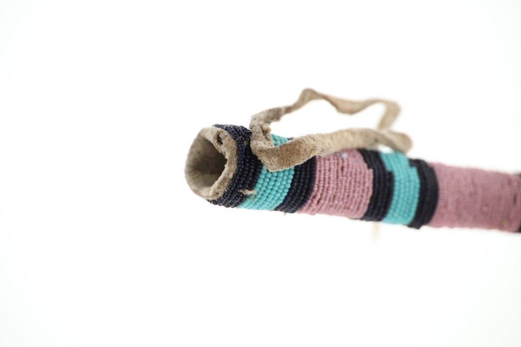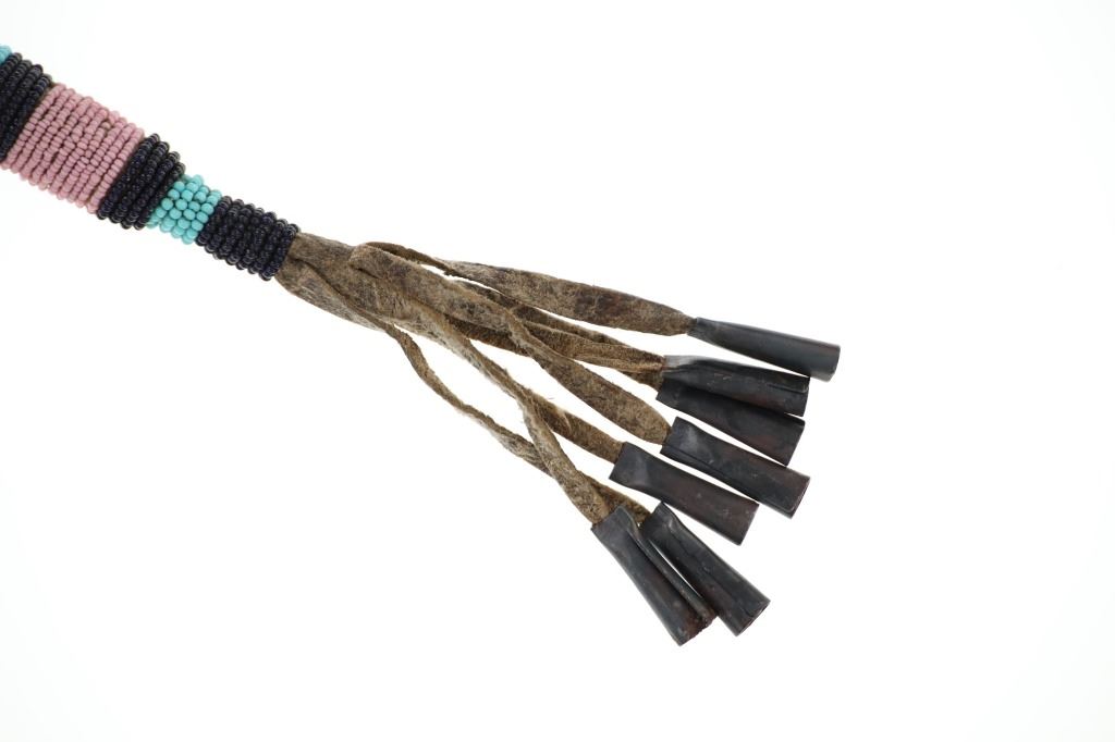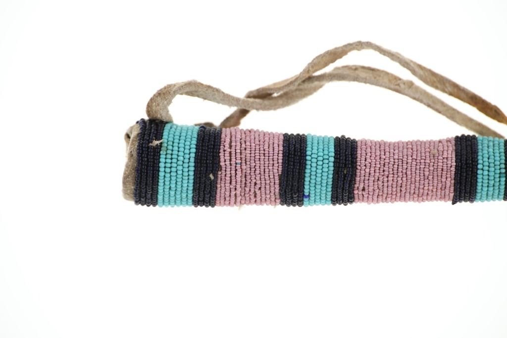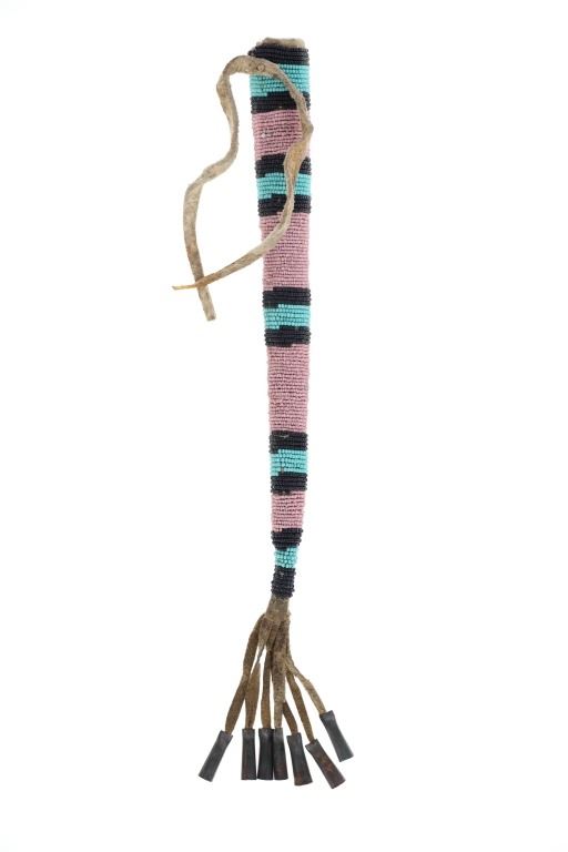 The lot features an early Kiowa Southern Plains awl case comprised of Indian tanned hide wrapped over parfleche with wonderful petit beadwork. The case shows early petit glass trade seed beads including Cheyenne pink, cobalt, and sky padre light blue. The beadwork is sinew sewn with a few late repairs. The bottom shows Indian tanned hide fringes with nice patina and rolled tin jingle cones at the bottom. Nice awl case. Measures overall 11-inches long.