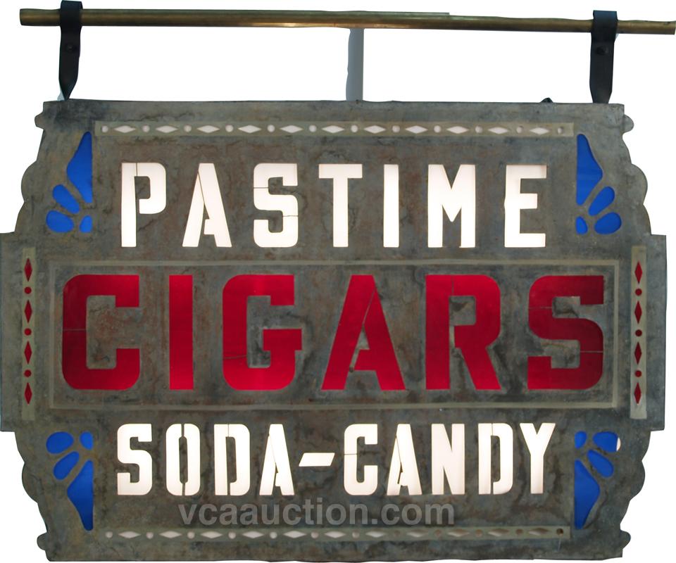 Early Large Metal Outdoor "Pastime Cigars, Soda - Candy" Double Sided Light-Up Sign, from an actual bar in Idaho back in the prohibition period c1929, restored w/ hanging bracket - 41" x 28" x 6" deep