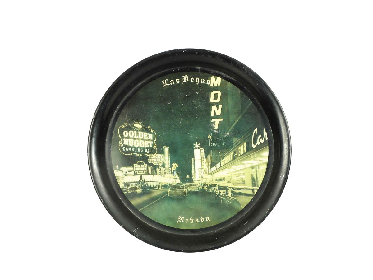 Early Las Vegas Nevada Tin Serving Tray. Some scratches and dents otherwise good condition. 11 inch diameter.