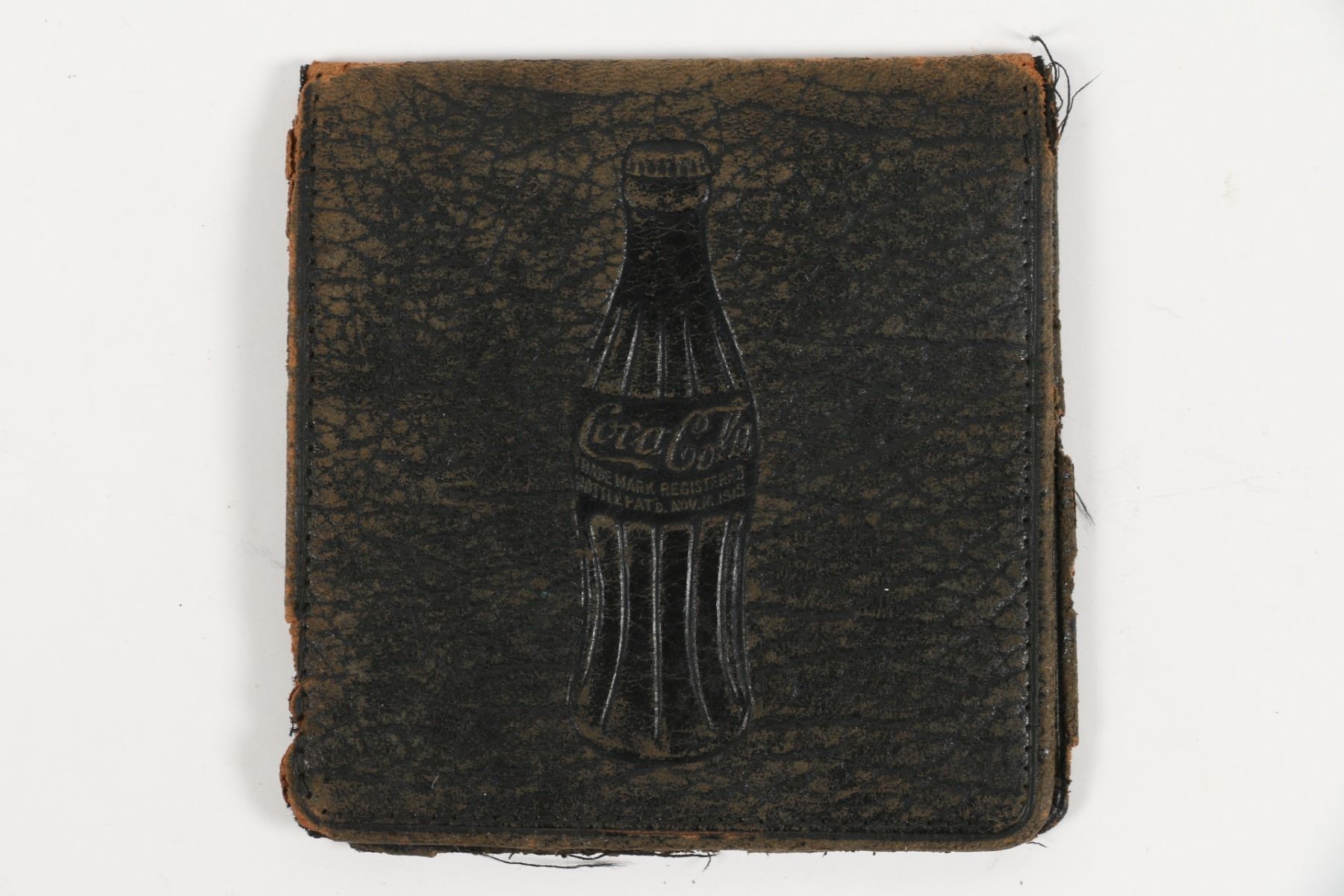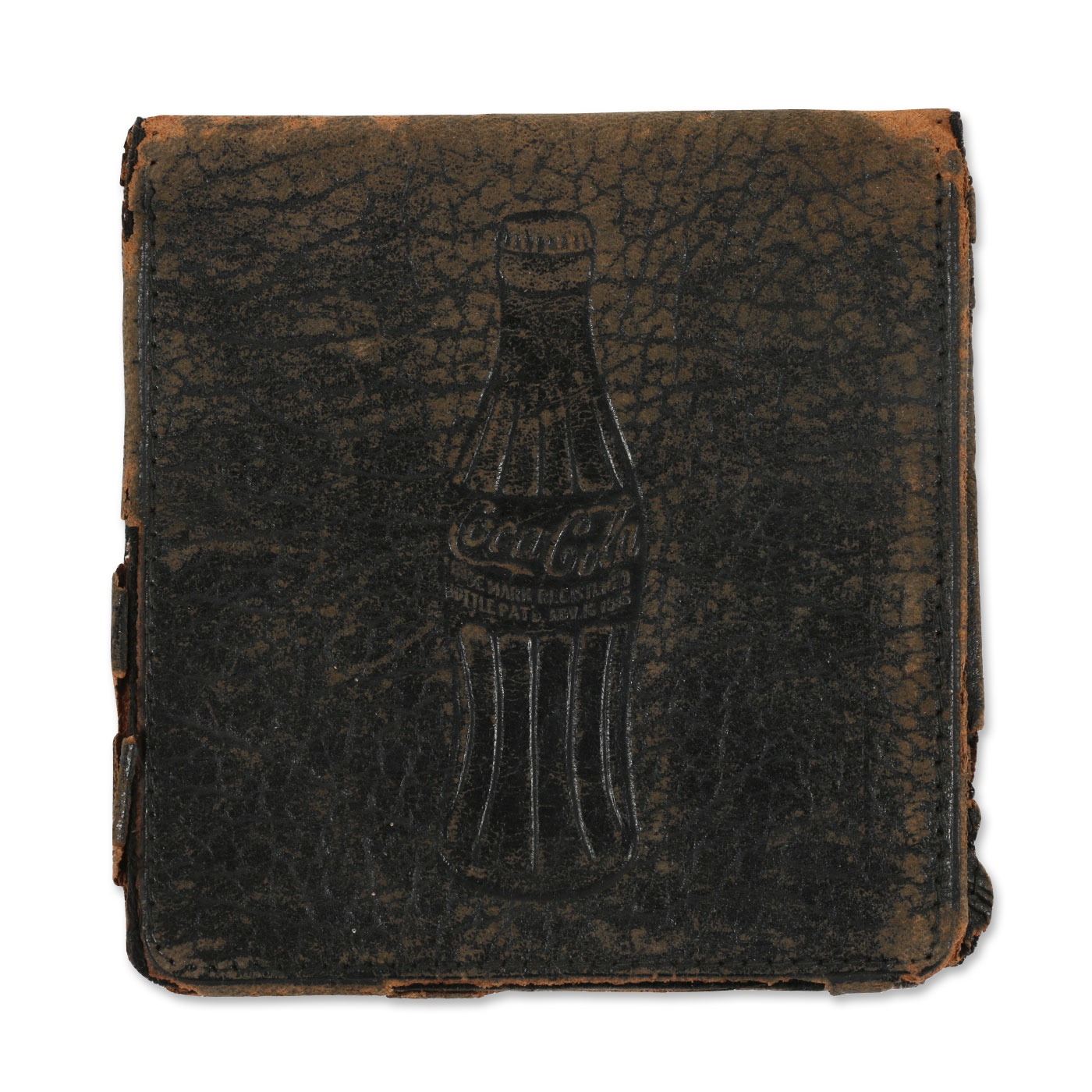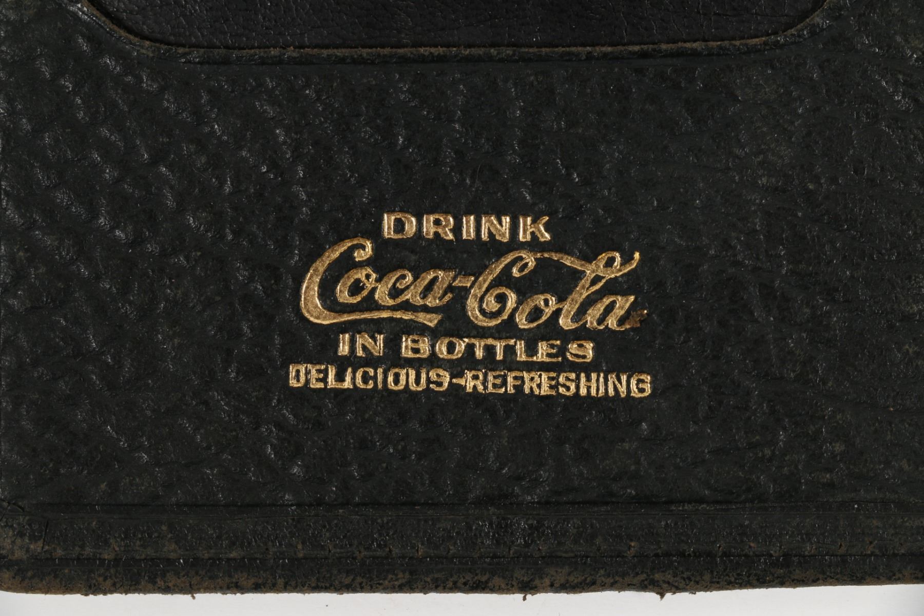 Impressed bottle on front and rear faces. Embossed, "Drink Coca-Cola in Bottles" within. 8.25" x 4" unfolded. Dry leather with spine wear. $200-300.