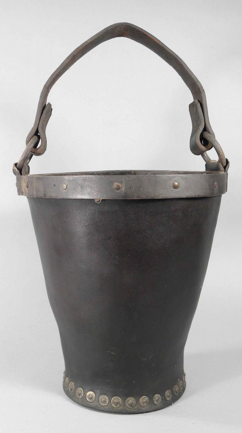 Early Leather Fire Bucket with handle. Metal strap around top and brass rivets around bottom. Very good condition. 10 1/2 inches tall w/o handle.
