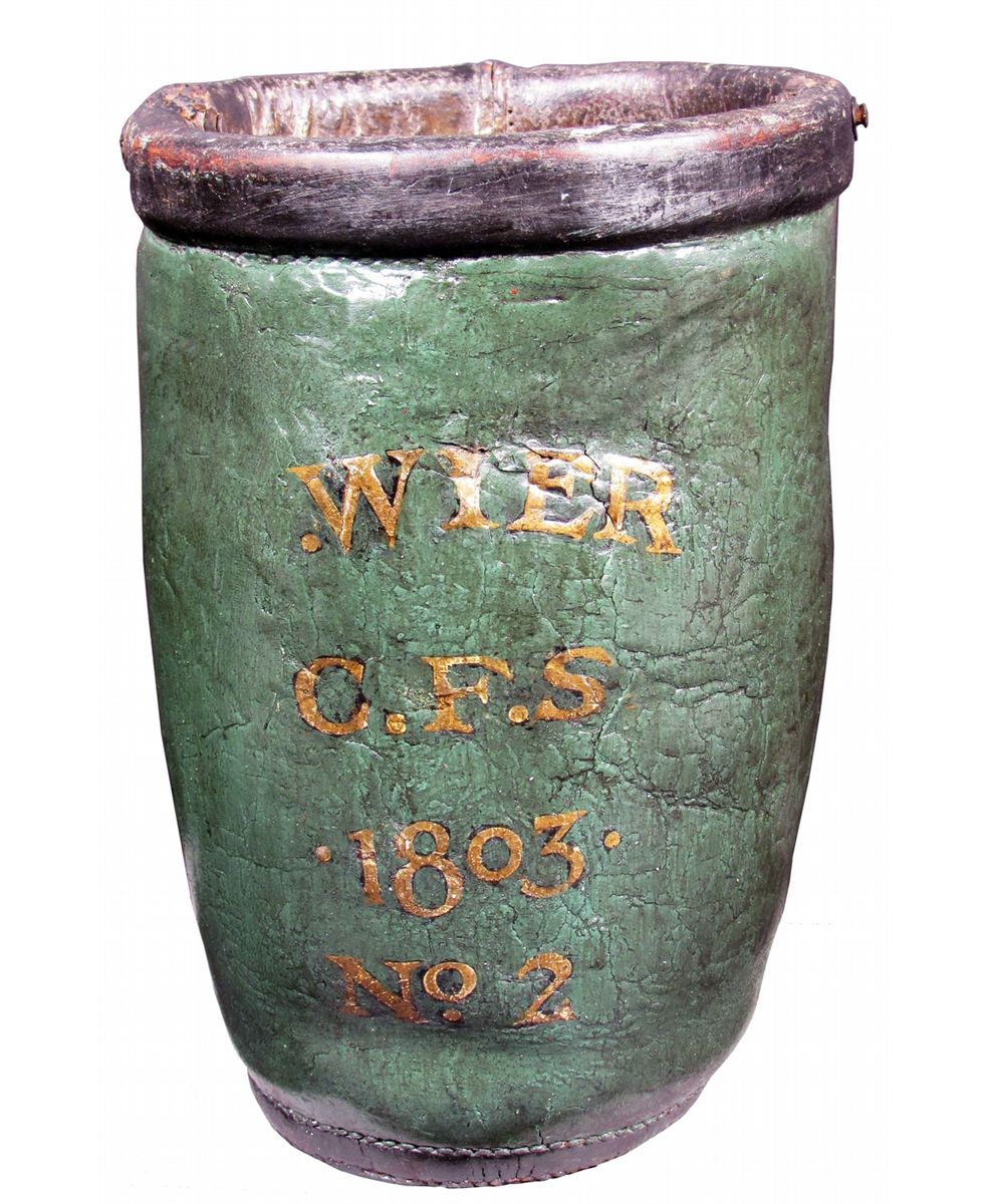 Early Leather Fire Bucket. Painted green with gold stenciling. Wier, F.F.S. 1803, No. 2. Missing handle otherwise good condition. 12 inches tall.