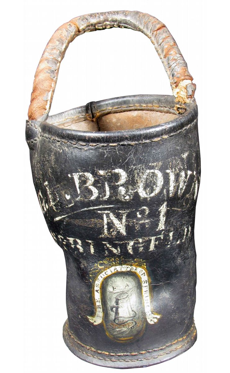 Early Leather Fire Bucket. Hand painted motif with G.L. Brown, Springfield, No. 1. Depicting wood hydrant and hose with Fire Assn. of Springfield. Warping and leather wear on handles. 11 inches tall.