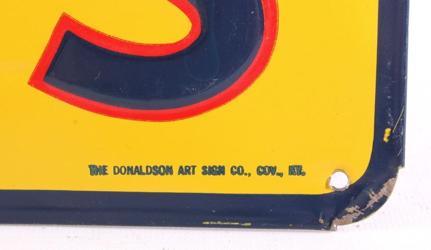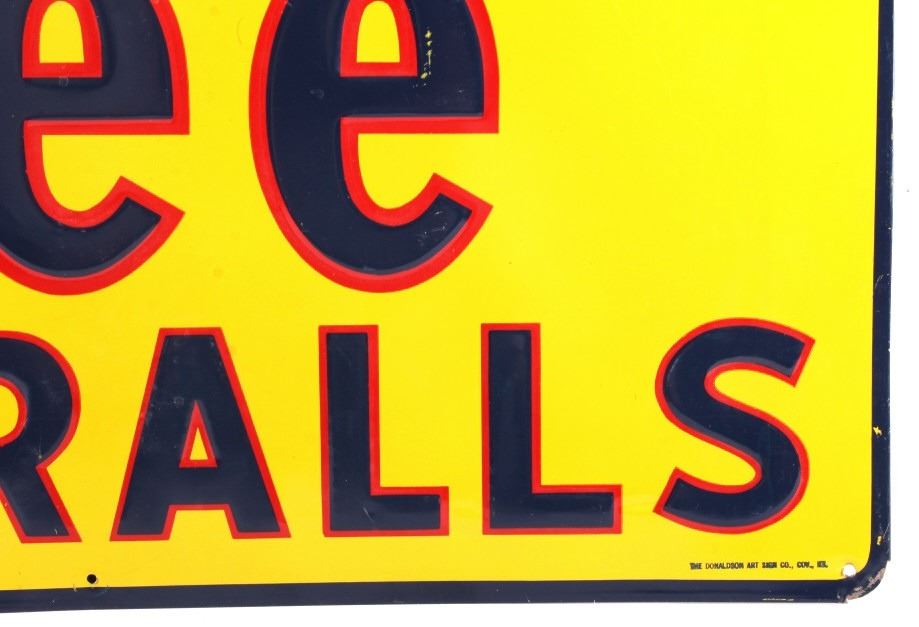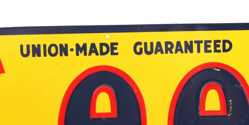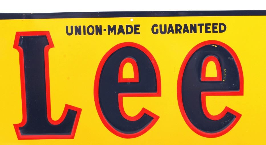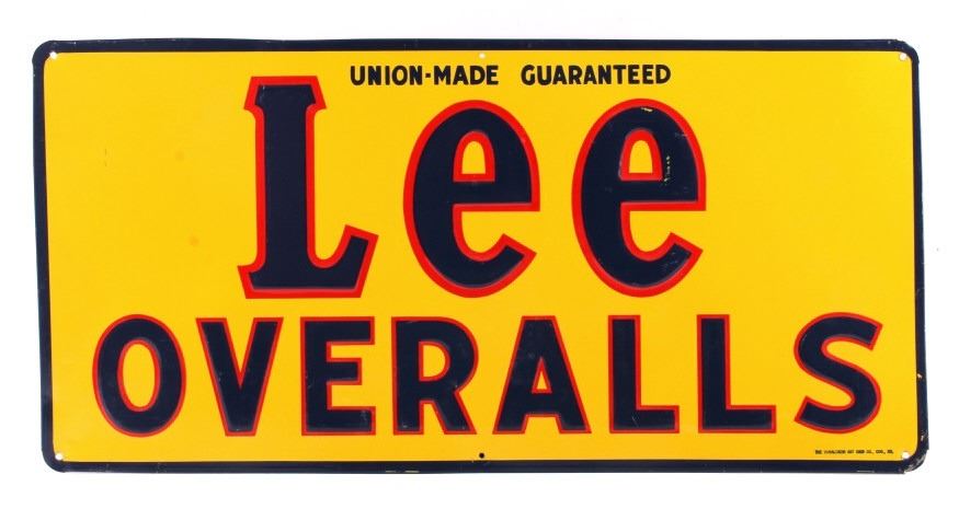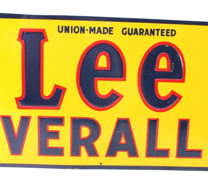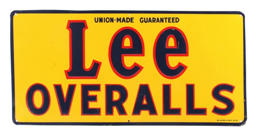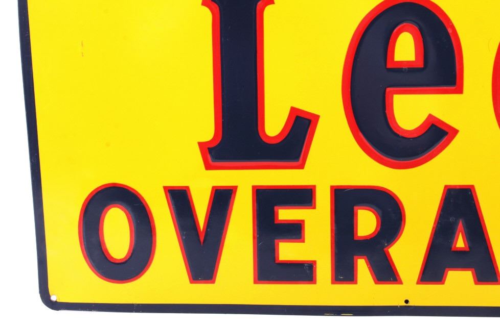 This is a Lee Overalls advertising sign. The sign is embossed tin and reads "Union-Made Guaranteed Lee Overalls". The sign is marked in the lower right corner "The Donaldson Art Sign Co., Cov., KY.". The sign is in good condition. It measures 11.25" x 23".