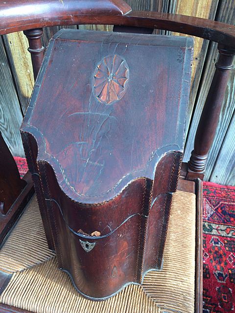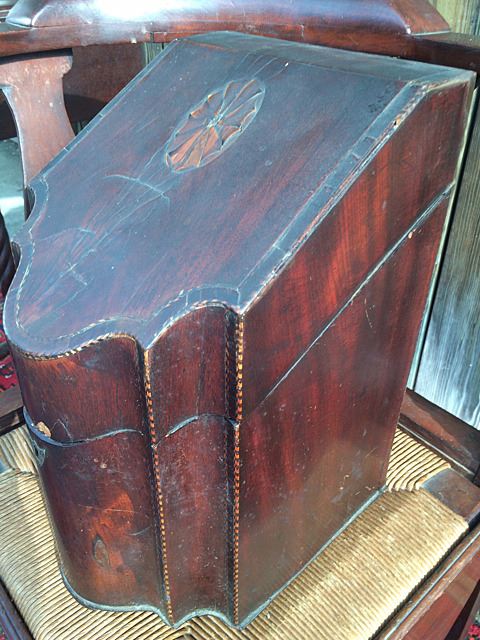 Early lift top knife box with inlays, nice key enscution, oval inlay on top.