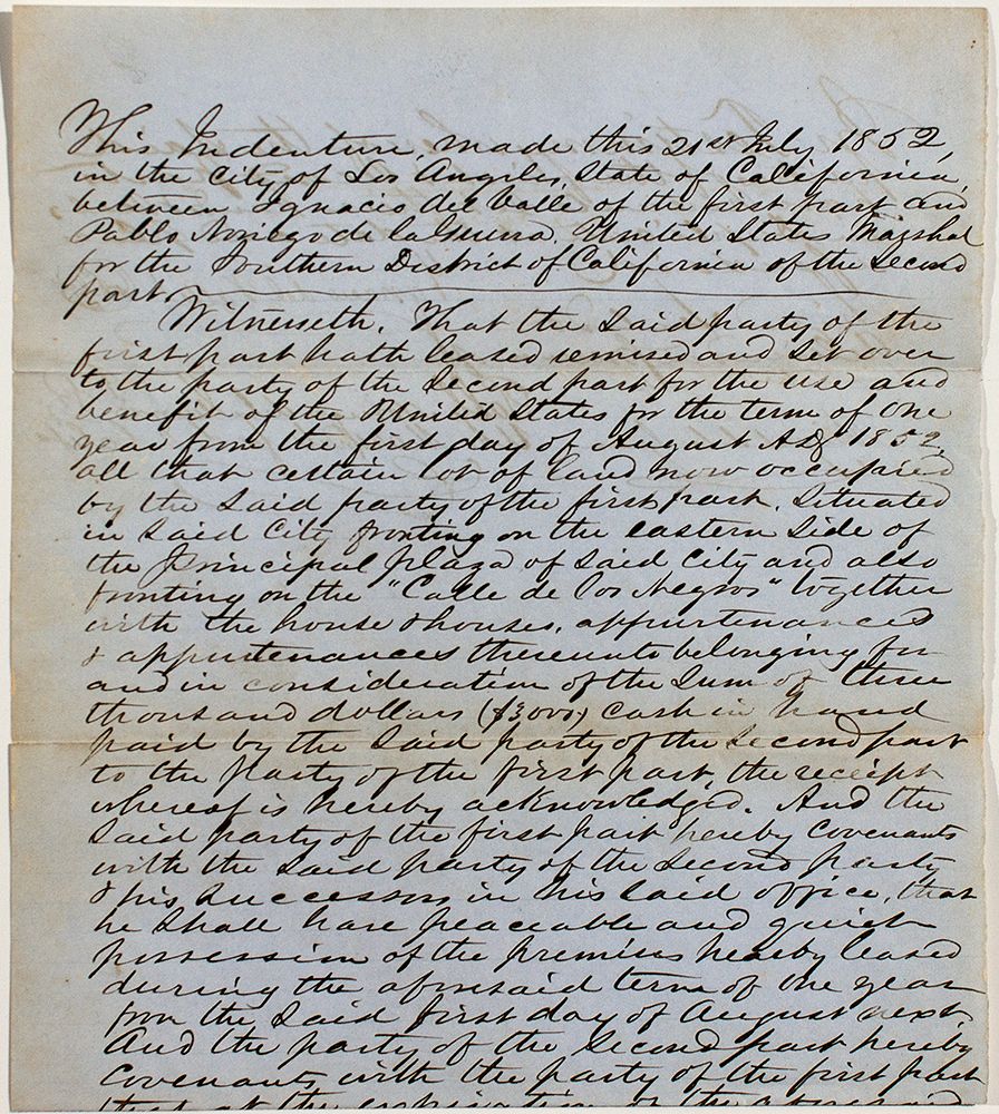 1852 This is a letter dated July 21, 1852 that is an agreement between the city of Los Angeles and Pablo Noriega de la Guerra, marshal of the district for the lease or sale of a parcel of the city known as Calle de Negroes (Street of the Negroes). At one time the area was home to many prominent families, but gradually turned into a slum in the 1860's, becoming LA's first Chinatown. This is a rare document and signed by the parties involved in the transaction, Miguel de la Guinna, L. Lancaster and Guerra, plus Ygnacio Del Valle, the "Alcalde" of Los Angeles in 1850. He was a former Mexican General who settled in southern California, and had a huge family ranch, known as "Rancho Camulos." He even served for a short time in the California State Assembly. It is in very good condition, considering its age and a must have for any Los Angeles collector. Lynn Langdon Collection - HKA#65624