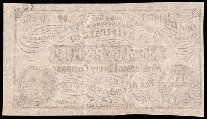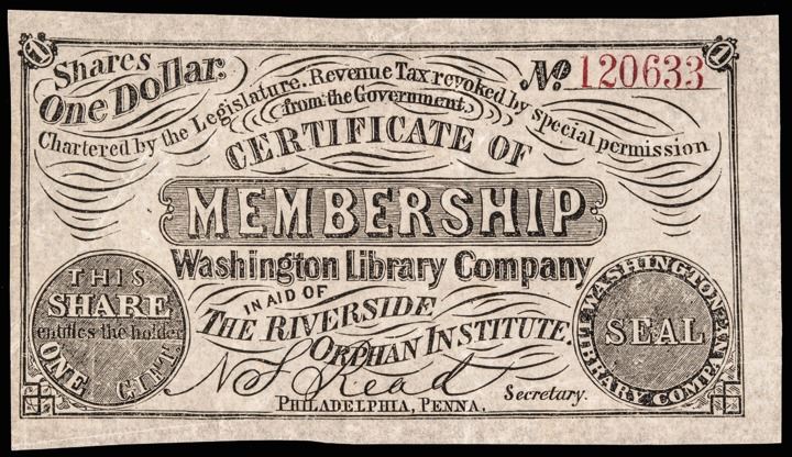 This highly ornate printed Lottery Ticket was designed in the form of a membership certificate in the Washington Library Company, of Philadelphia, PA. It was issued in aid of the Riverside Orphan Institute. The Washington Library Company was first organized in 1813 and opened its doors in 1816. This $1 ticket, measuring 2.5” x 4.5” is printed in black on fresh wove period paper, having the printed signature of “N. S. Read” and red serial number. It is well printed, unused, and has four large margins. Very scarce, and nice for display!