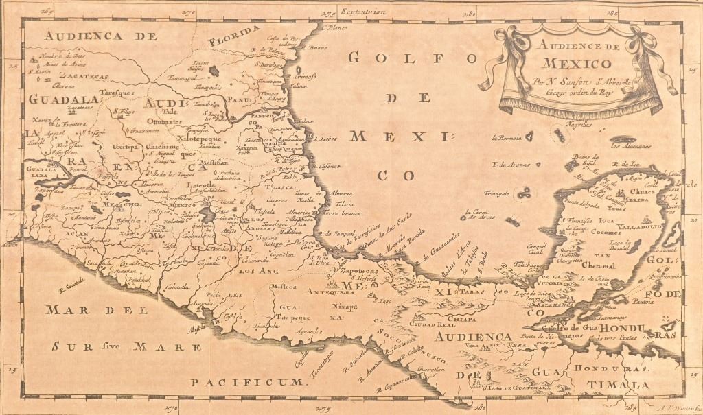 Audience de Mexico. Nicolas Sanson. Circa 1662-1700. A very early map of Mexico from the Rio Grande south to the Yucatan and what is today Honduras and Guatemala. Shows extreme southern tip of Texas, marked “Florida,” and the mouth of the Rio Grande which was known then as the Rio Bravo (marked “R. Bravo”).