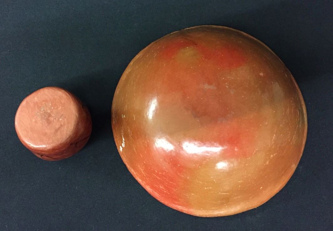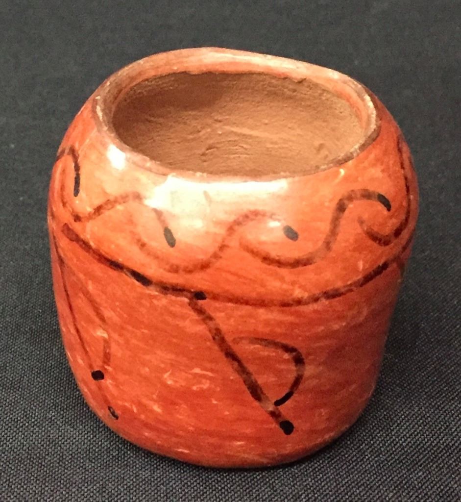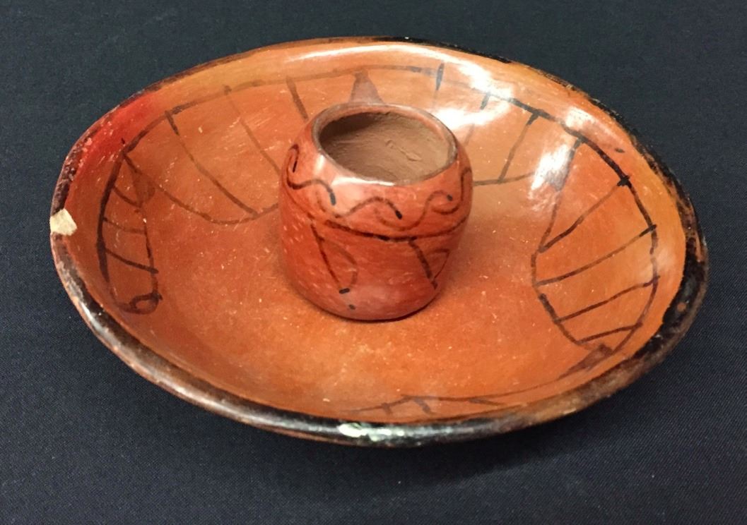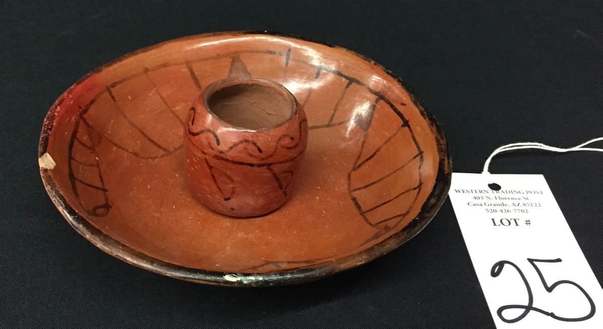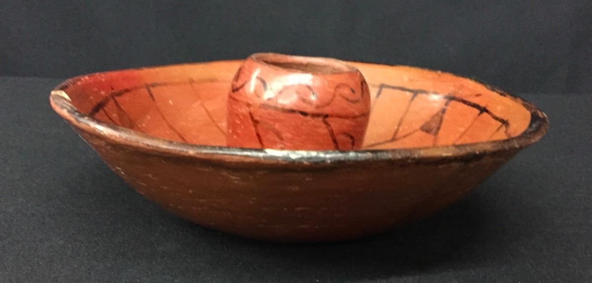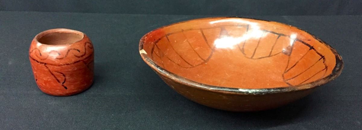 The bowl measures 6.5 inches wide by 2 inches deep and has a small chip in the rim. The other pottery vessel is 2 inches wide by 2 inches deep. Unsigned (probably 1940s or earlier). Please look closely at pics - they are an important part of our description. Shipping: There will be a $7 handling / packaging fee for shipping this lot. The actual cost of postage will be added on top of that.