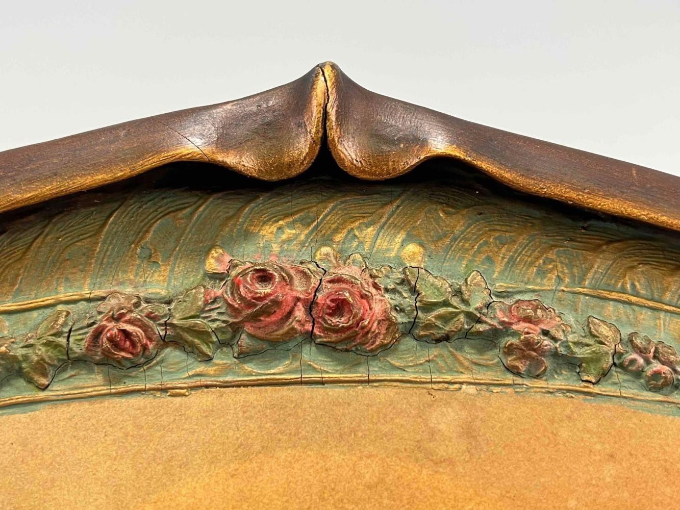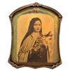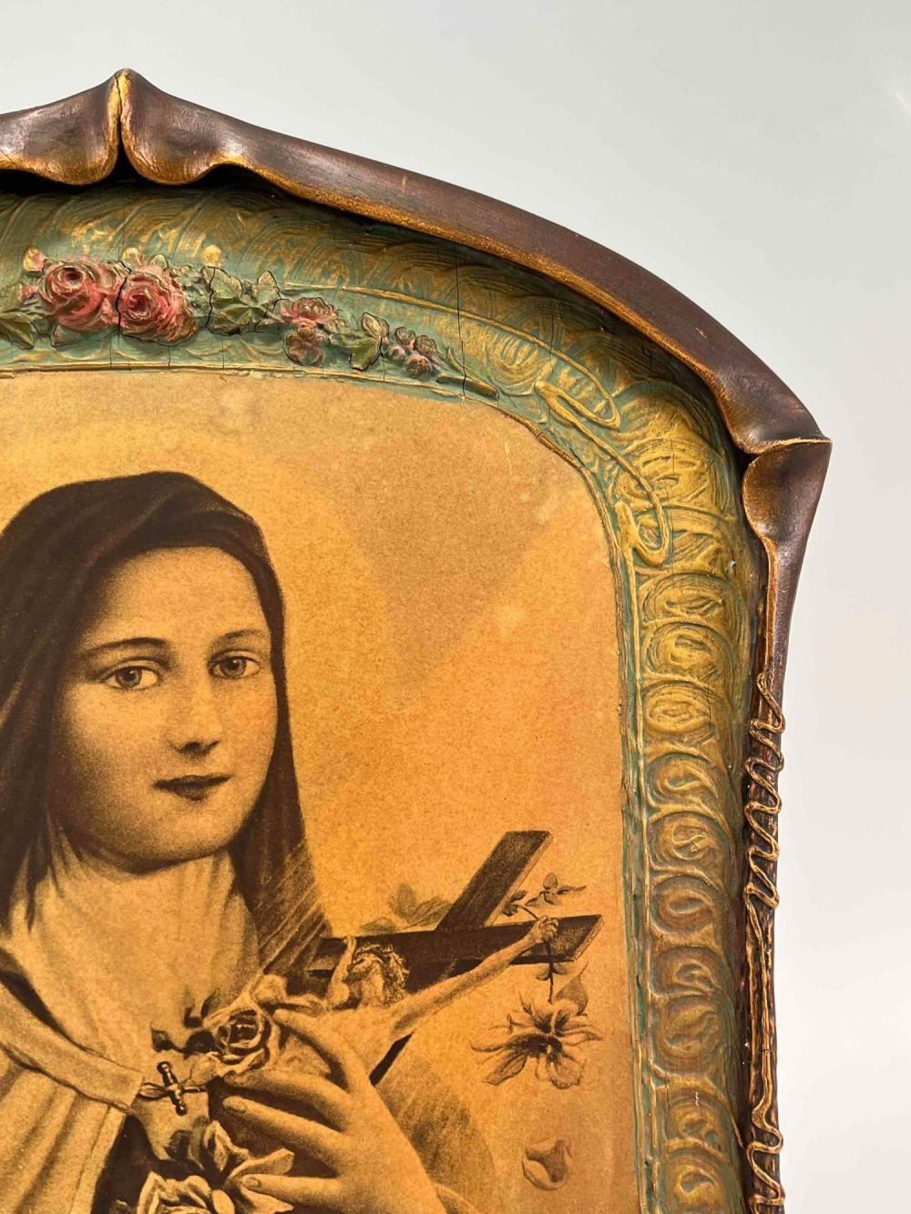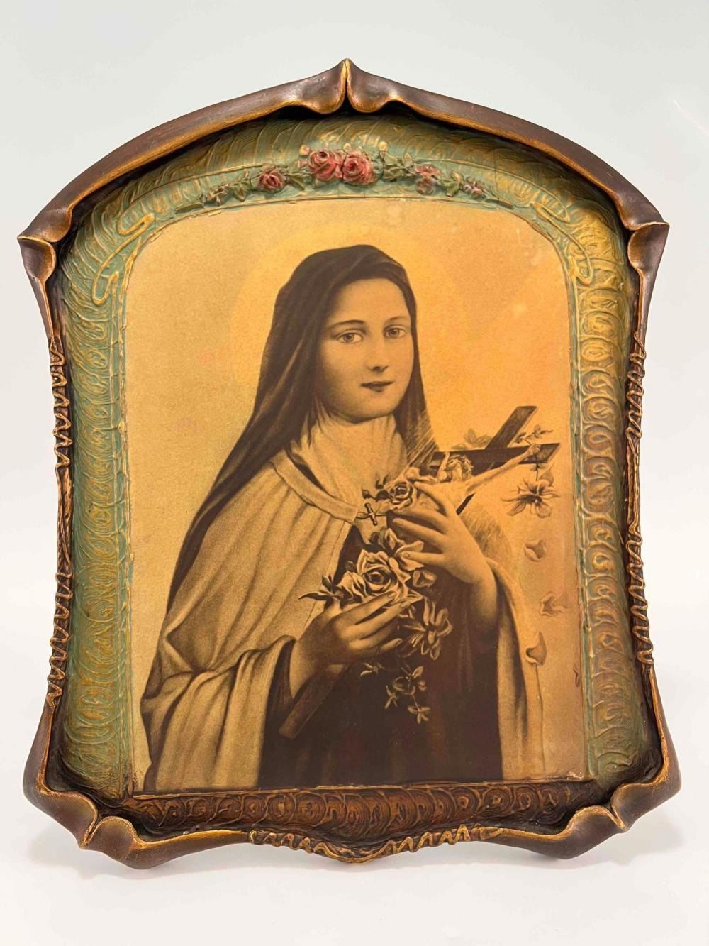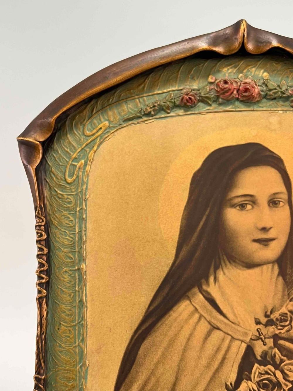 Virgin Mary With Roses Print In Ornate Gilt Frame. Unmarked. Approximately 15.75L x 13.0W in. Sight Approximately 11.25L x 9.0W in.