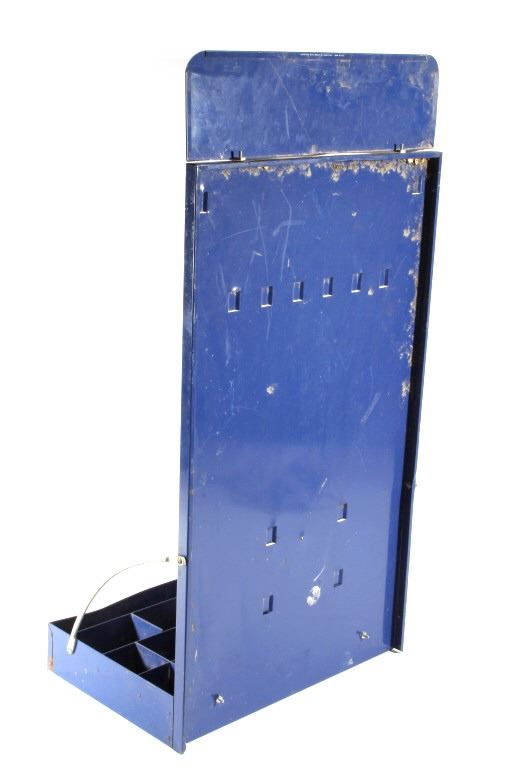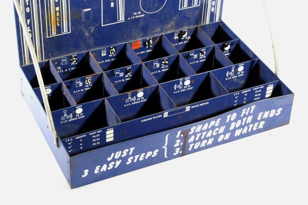 This lot features a Early Metal Plumb Shop Copper Tube Display Rack. The rack features several storage bins, crisp bright graphics, and hanging spots. This rack would be set up in a hardware shop. This piece is in good condition, showing wear from age and use. It measures 35 1/2" H x 18 1/2" W x 12" D