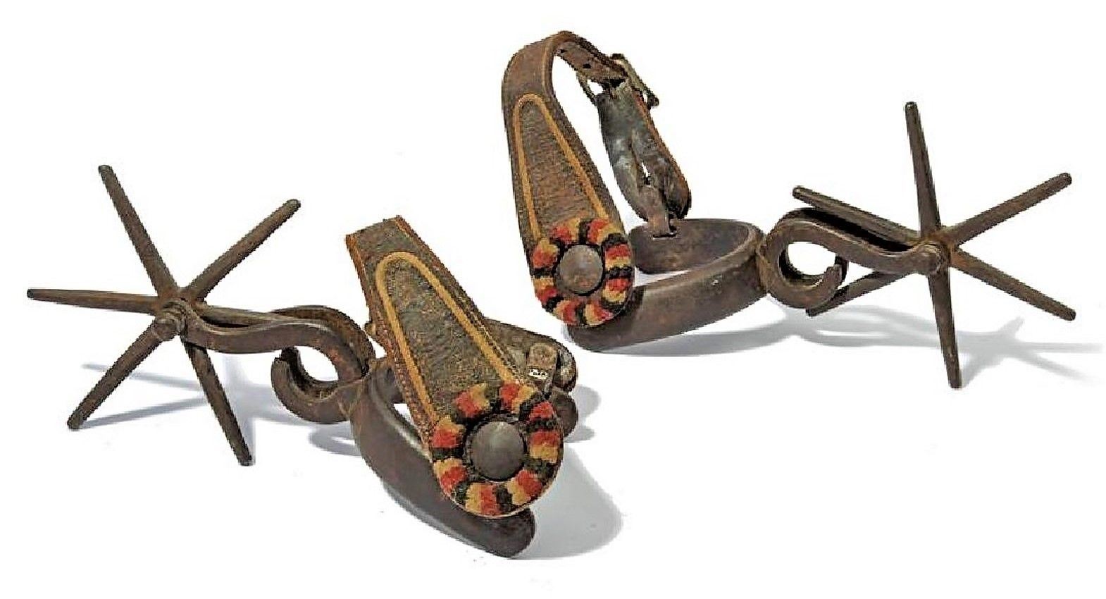 Massive early iron spurs with huge five point rowels and original pitiado straps.