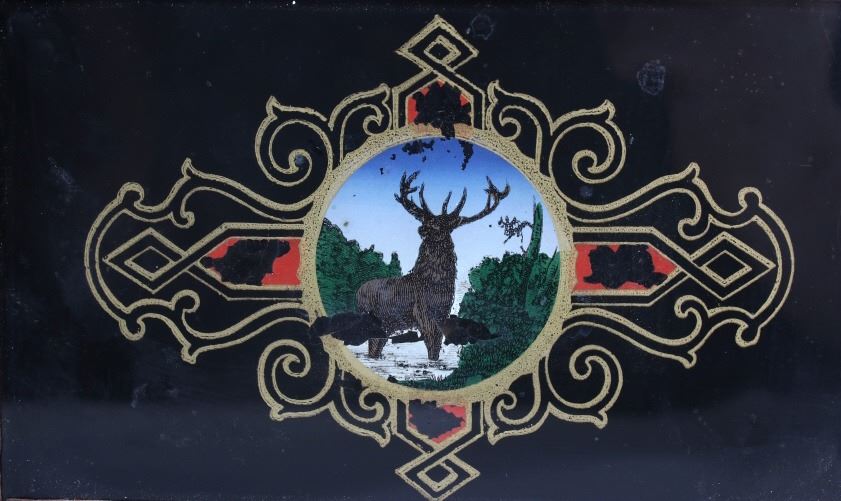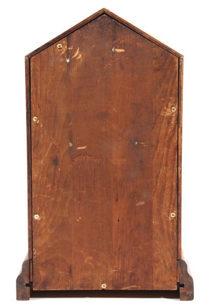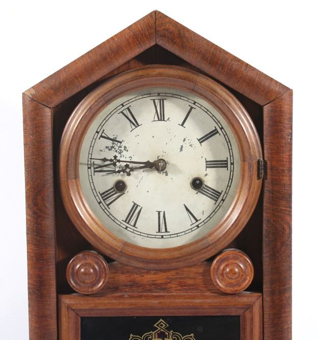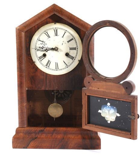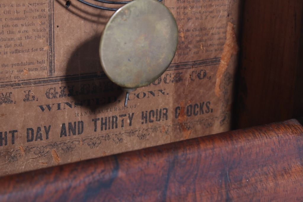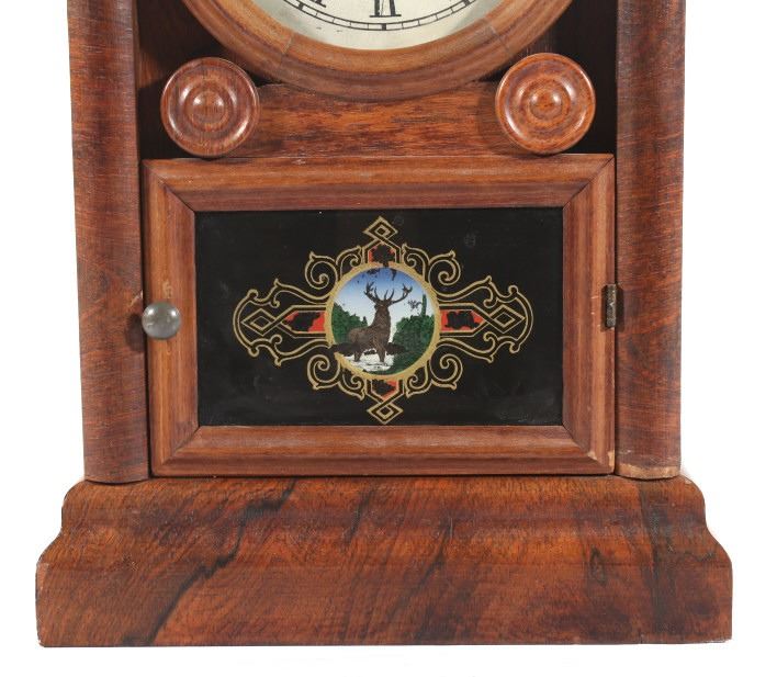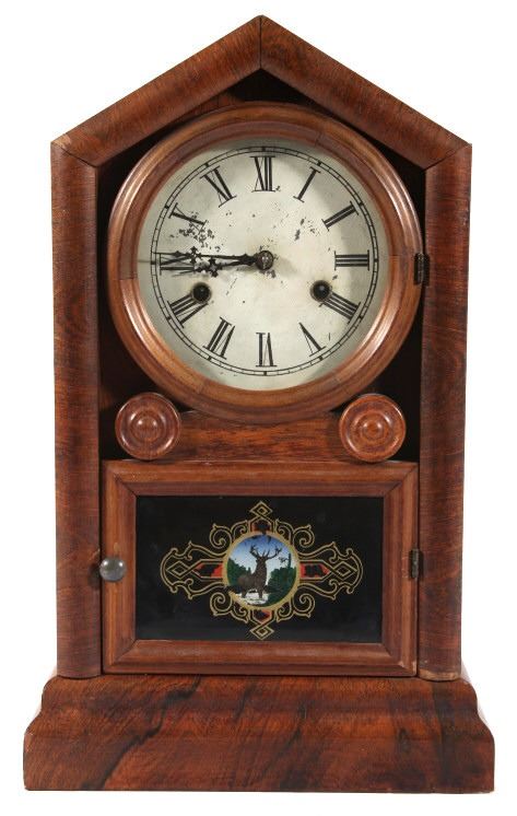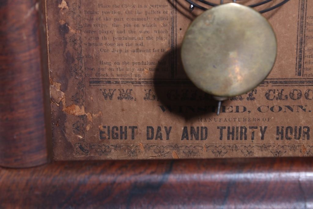 Available in this lot we have a WML Gilbert Clock Co. shelf clock originating from the early to mid 20th century. The clock shows wood construction with a walnut veneer and a painted tin clock face. The front of the door shows a reverse painted elk motif on the lower glass pane. The door opens with a twist knob with the interior of the clock marked on back wall reading "WML. Gilbert Clock Co. Winsted, Conn. Manufactures of Eight Day and Thirty Hour Clock". The piece comes with a clock key and has been repaired to by fully functional. The clock shows good condition with some minor wear due to age. The piece measures 10 1/2" wide by 17 1/4" tall by 4 1/4" deep.