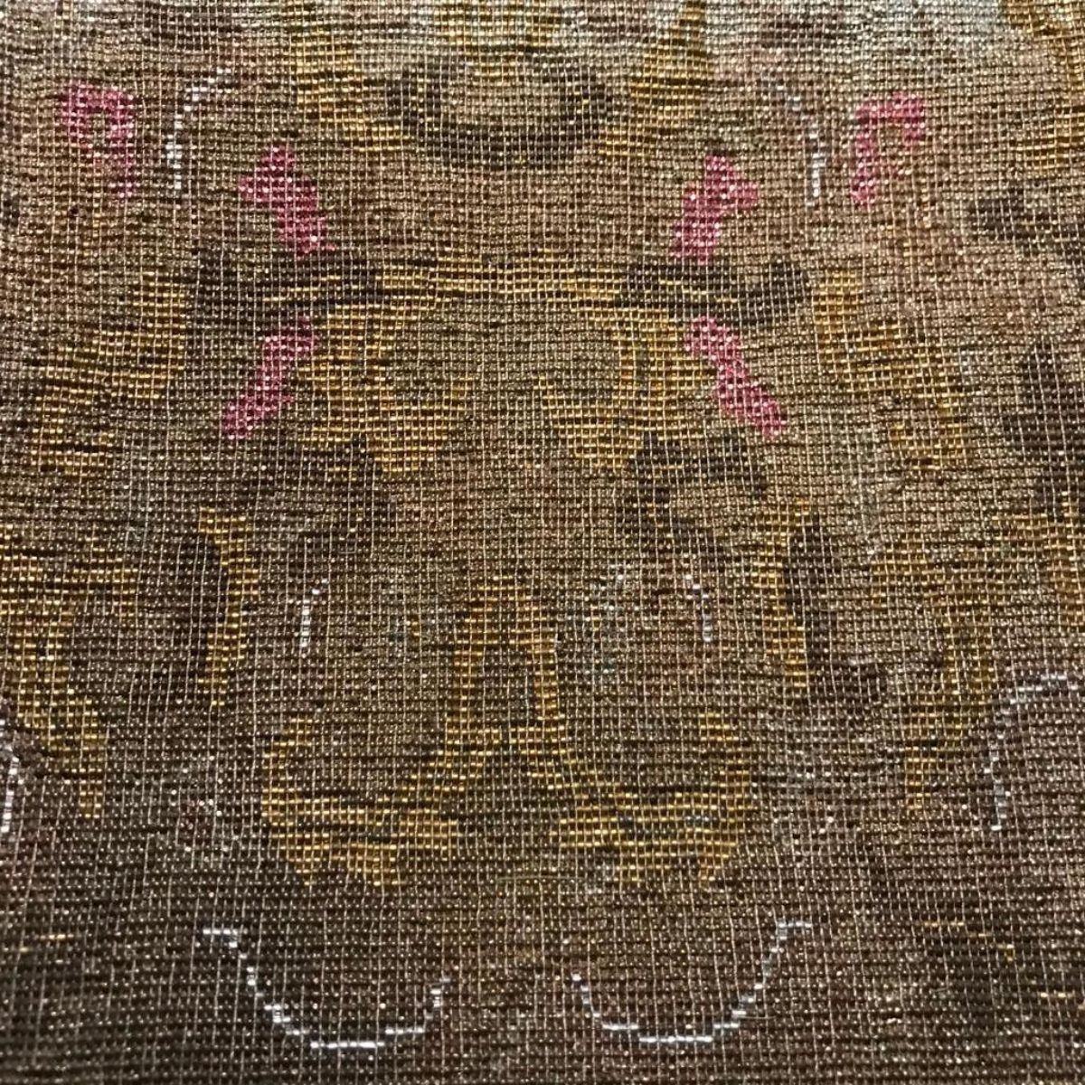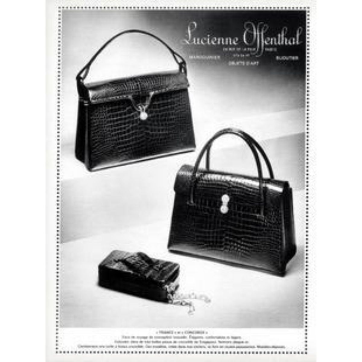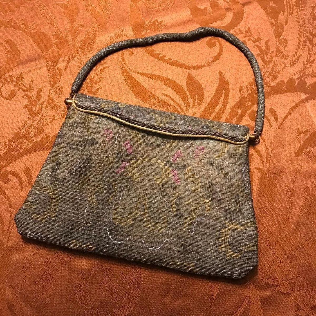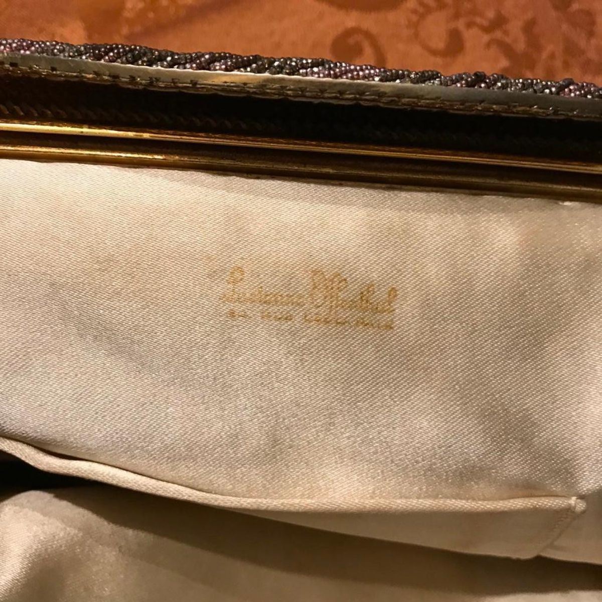 Early to mid 20th Century designer, Lucienne Offenthal Paris, French petit point tapestry metallic beaded purse, evening bag. Pink & gold pattern tapestry design. Satin interior  with small pocket, stamped above - “Lucienne Offenthal 24 Rue De La Paixâ€. 8 1/2" W X 6" H & 1 1/2" - 4" D from closed to open. 6" strap handle. * ad shown in pictures not included, for reference to designer.