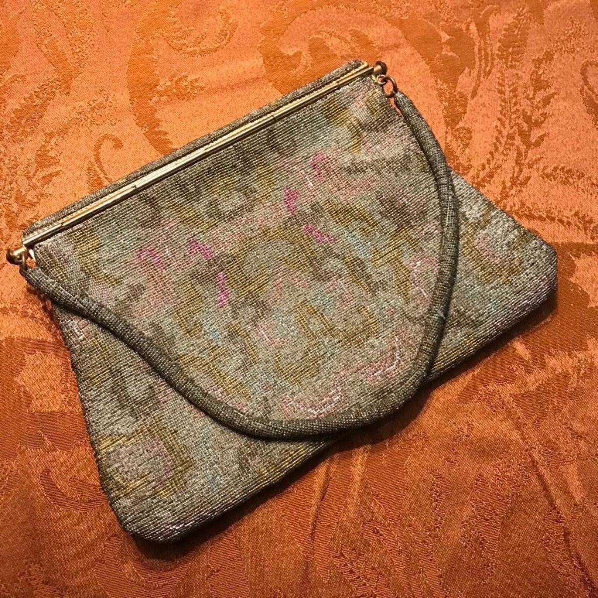Early to mid 20th Century designer, Lucienne Offenthal Paris, French petit point tapestry metallic beaded purse, evening bag. Pink & gold pattern tapestry design. Satin interior  with small pocket, stamped above - “Lucienne Offenthal 24 Rue De La Paixâ€. 8 1/2" W X 6" H & 1 1/2" - 4" D from closed to open. 6" strap handle. * ad shown in pictures not included, for reference to designer.