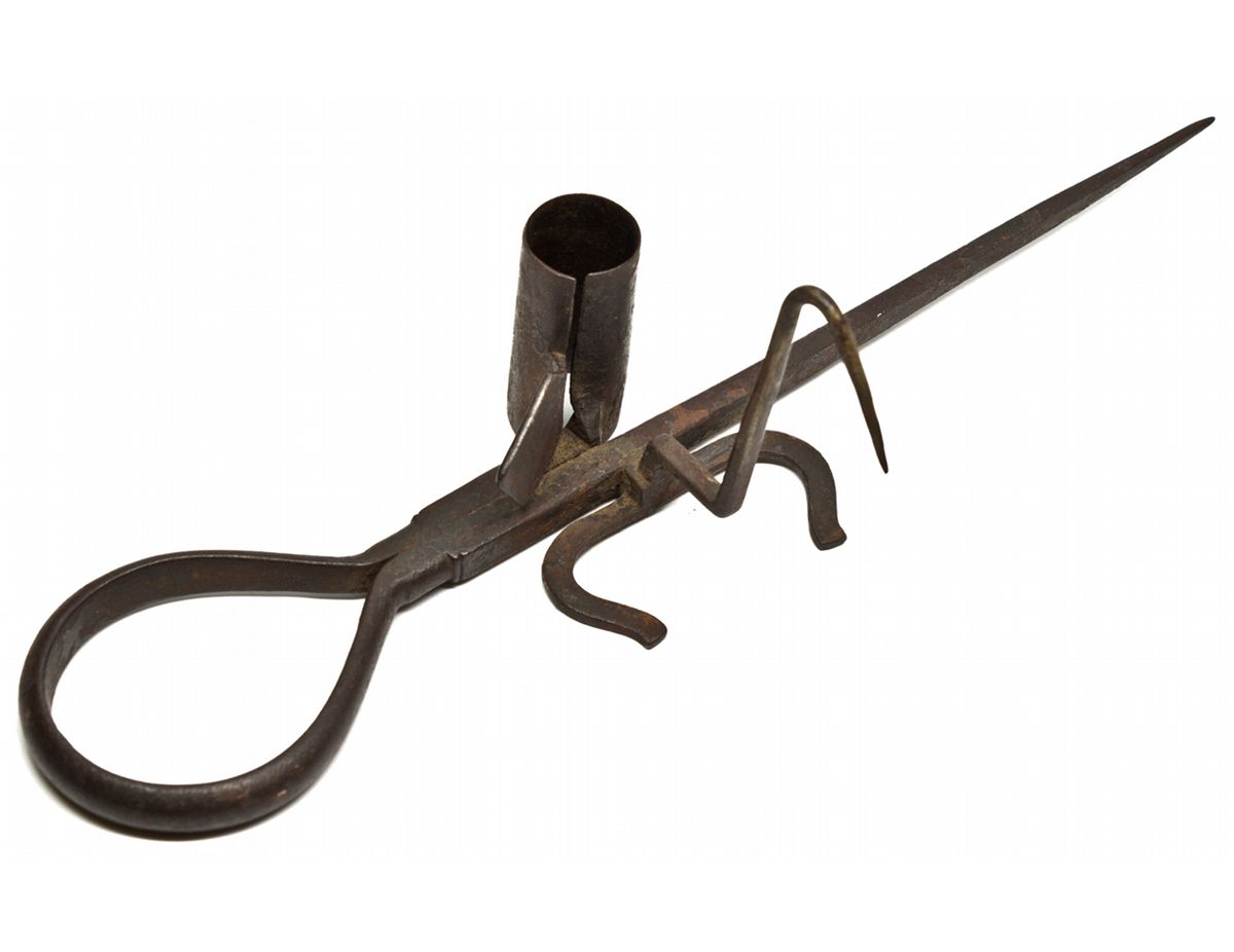 Early non-mechanical stick. Measures 11.75" long. Appears to be iron construction. Large diamond shaped lever on thimble. Tapered hook, with unique horse-shoe shaped stand-off at base of hook. Not in Wilson, RCS 31. - Ken & Rosemary Roberts Collection -59146