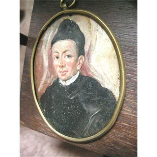 We offer a splendid antique miniature painted on what we assume is a brass plaque. Looking at this treasure we can only assumee from the colouration that the painting comes from Spain or Portugal. The man is magnificently painted. The gentleman is dressed in black with a white collar. It is painted in oils.