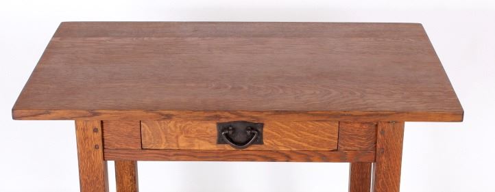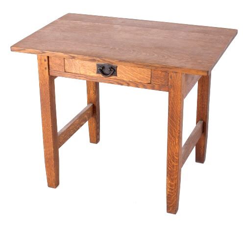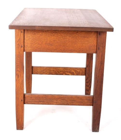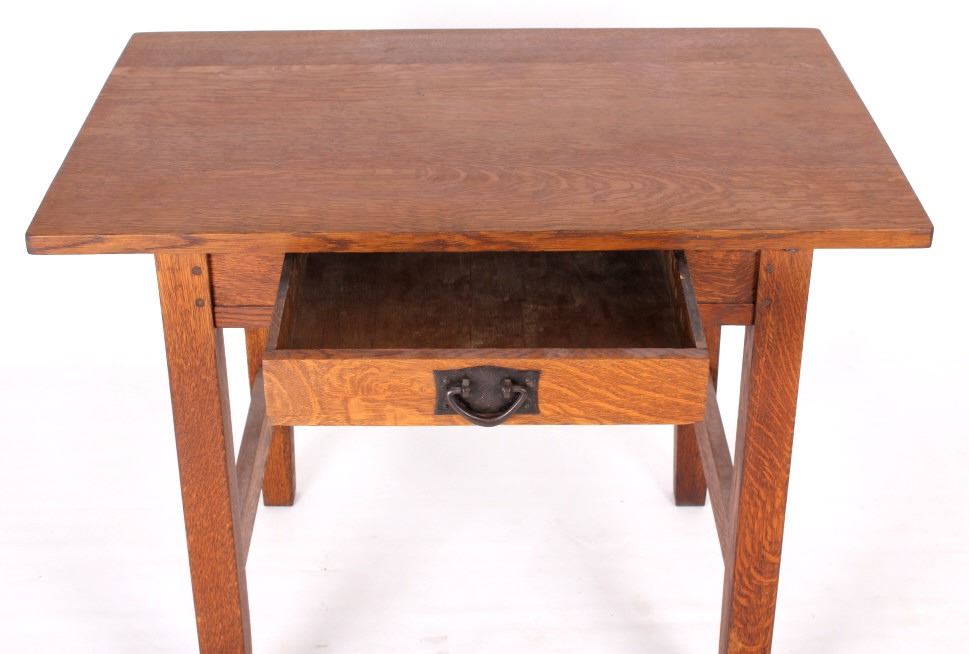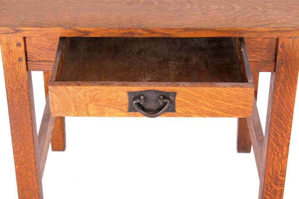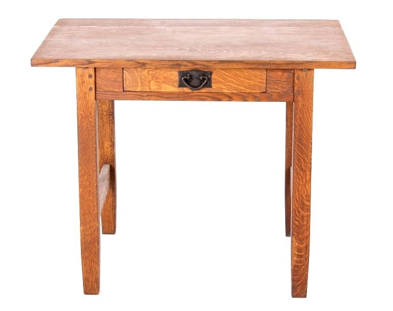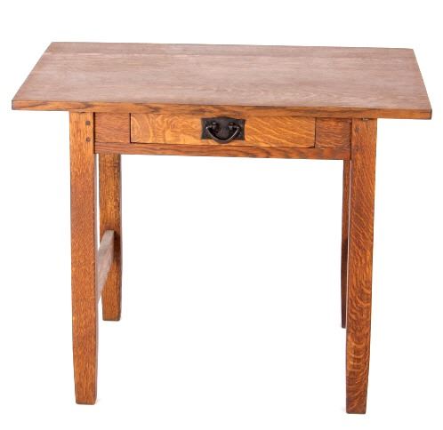 Included in this lot we have a Mission Arts & Crafts oak occasional table from circa 1900-1920. The table is made of quarter sawn oak and shows sturdy construction along with nice iron hardware . The piece features a single pull out drawer with dove tails in the front. The legs show slightly tapered feet and are attached with pins. The table shows a dark lacquered finish. The desk is constructed with solid quarter sawn oak with no veneers. The desk is done in the exact same styling and design as Roycroft, Gustav Stickley and Limbert. Truly a work of art done in the medium of oak.The table shows good condition overall with no wear or damage. The Mission oak table measures 36" wide by 24" deep by 29" tall. Provenance: From the Ladder Ranch & Diamond Bar 7 Brand located just East of Big Timber, Montana near the Montana Crazy Mountains.