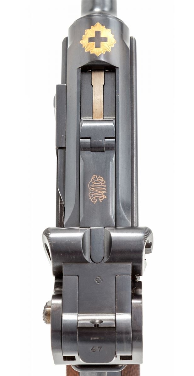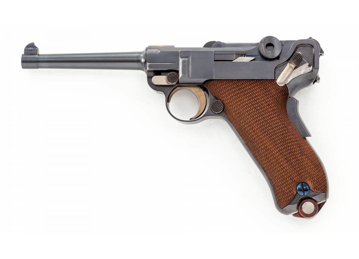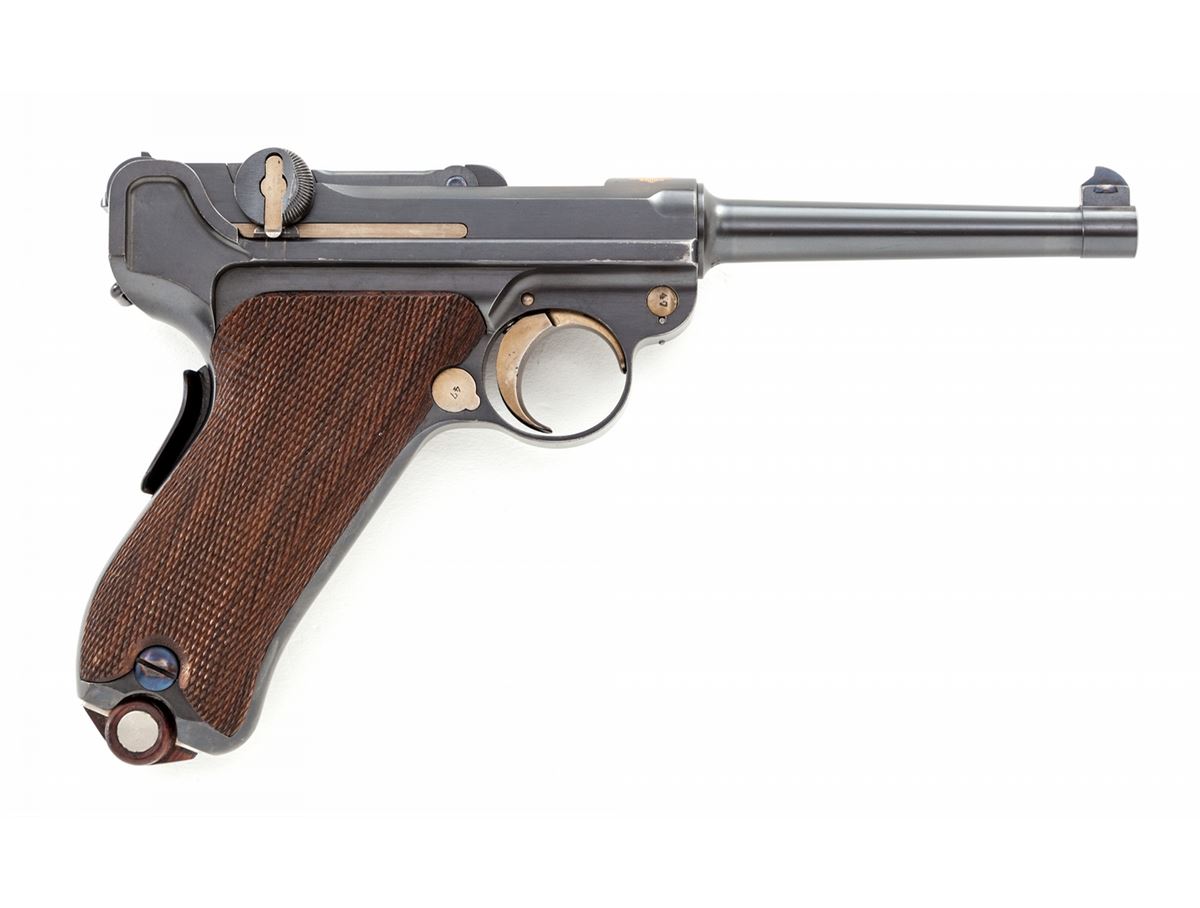 Early Model 1900 Swiss Commercial Luger, #1147, .30 Luger cal., 4-3/4'' barrel, blue finish with straw small parts, checkered walnut grips, with original nickel-plated magazine with walnut base having metal inserts to both sides. Early checkered thumb safety, lower portion of safety area polished bright, early dished toggle knobs, as well as grip safety. Chamber area marked with Swiss Cross in sunburst, DWM logo to central toggle link, both of which have been highlighted in gold. Condition is excellent showing light wear at muzzle, high forward edges of frame, and light wear to sideplate. Front and backstrap show only light wear from handling. Right grip panel may be a later replacement. Grip screws have been recolored. Action is crisp, bore is mirror bright. Est.: $4,500-$6,000. (C&R/PPT)