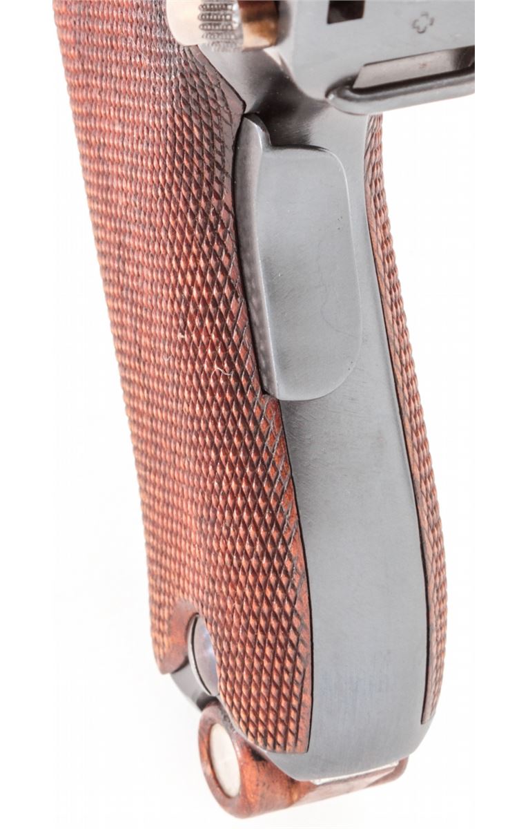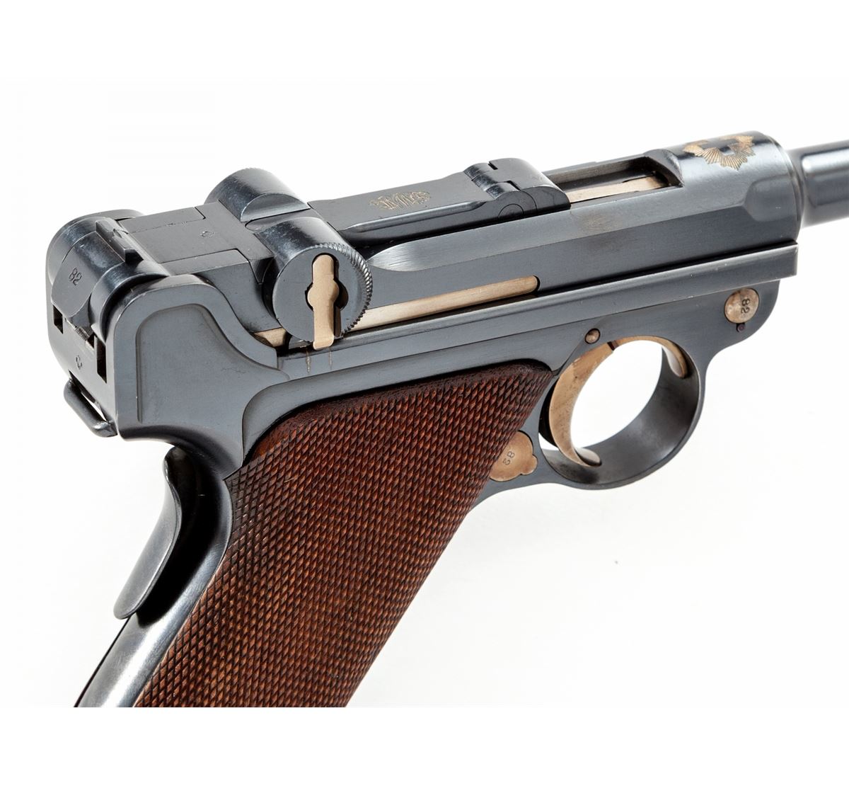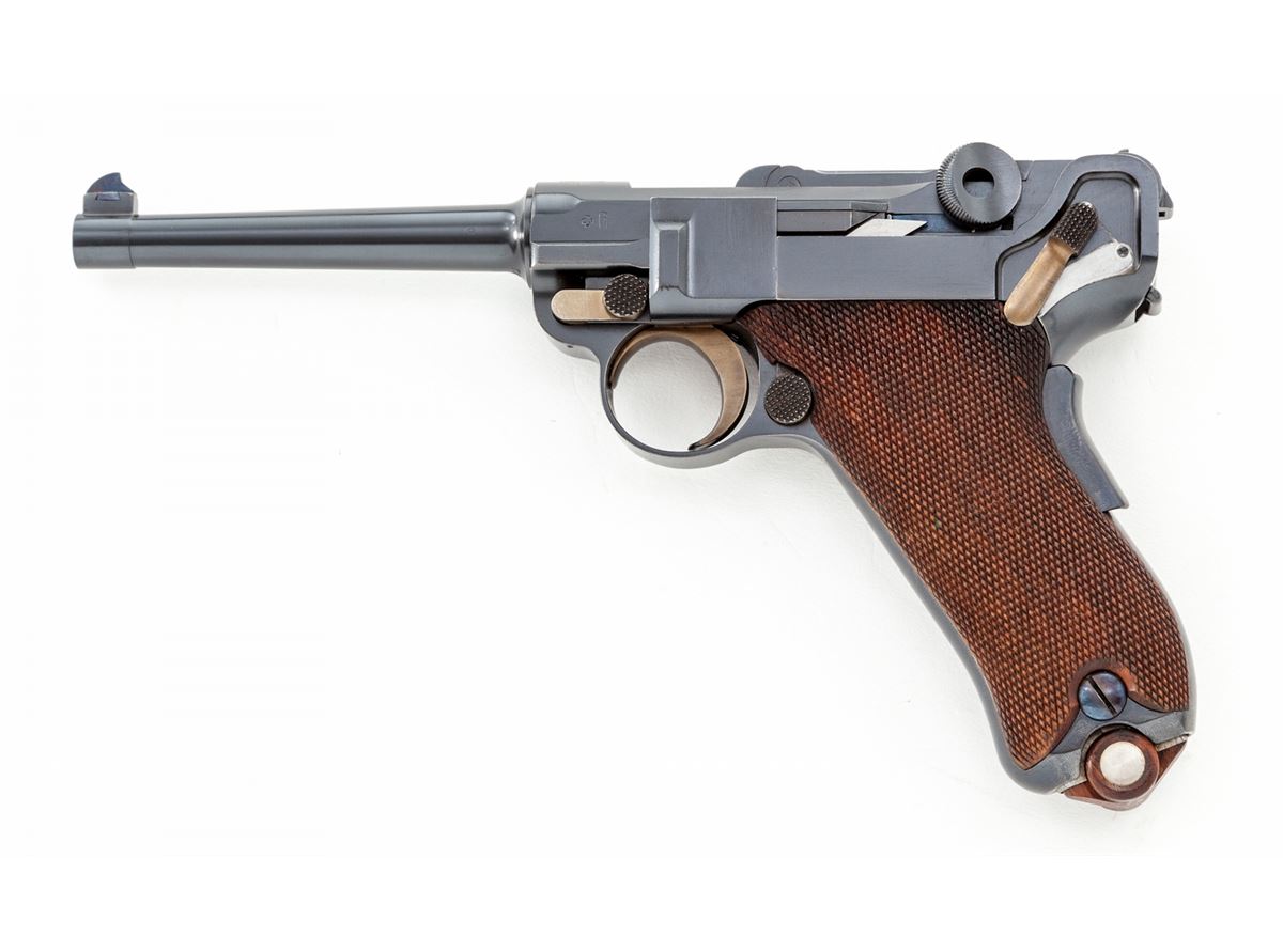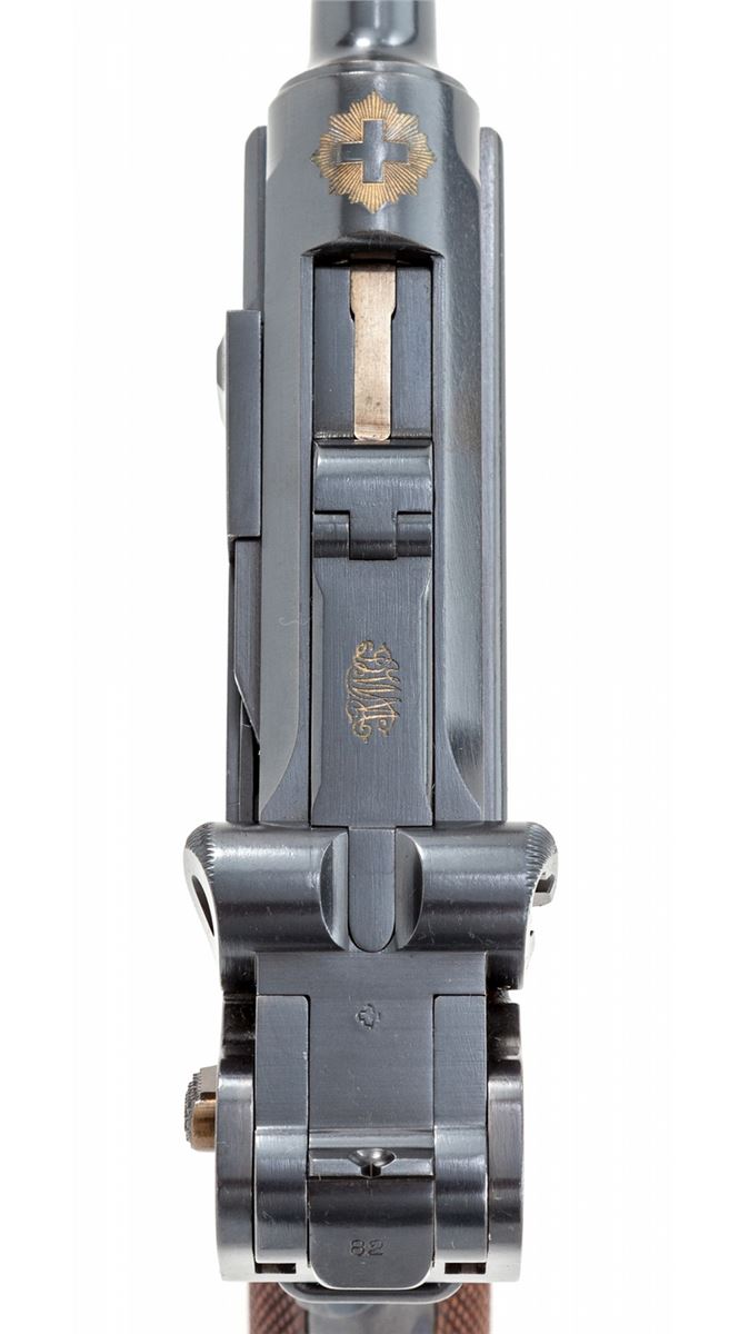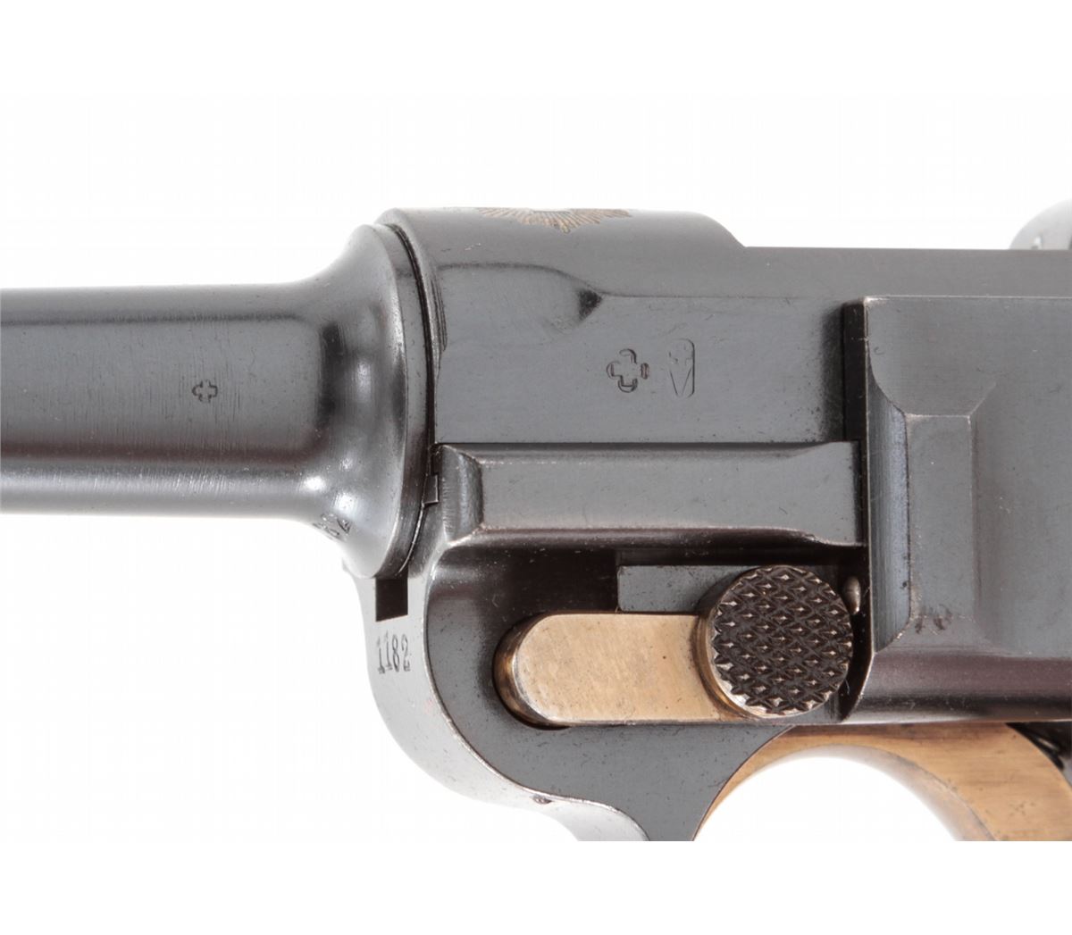 Early Model 1900 Swiss Commercial Luger, #1182, .30 Luger cal., 4-3/4'' barrel, blue finish with straw small parts, checkered walnut grips, with original nickel-plated magazine with walnut base having metal inserts to both sides. Early checkered thumb safety, lower portion of safety area polished bright, early dished toggle knobs, as well as grip safety. Chamber area marked with Swiss Cross in sunburst, DWM logo to central toggle link, both of which have been highlighted in gold. Condition is excellent showing light wear at muzzle, high forward edges of frame, and very light wear to sideplate. Front and backstrap show only light wear from handling. Grips show mild flattening and some oil darkening. Action is crisp, bore is mirror bright. Est.: $4,500-$6,000. (C&R/PPT)