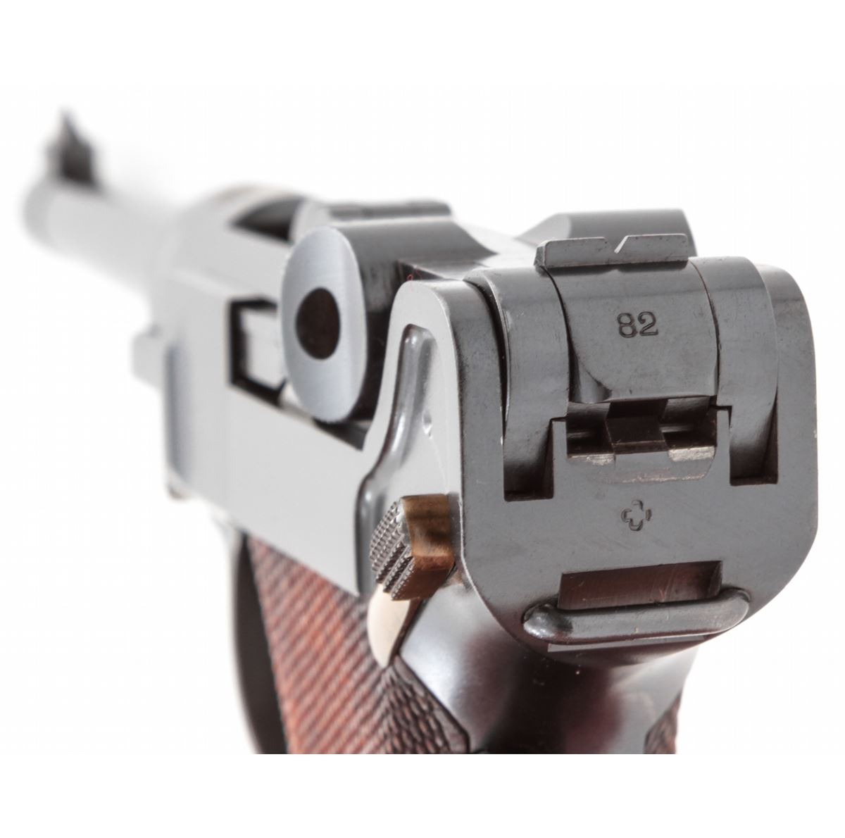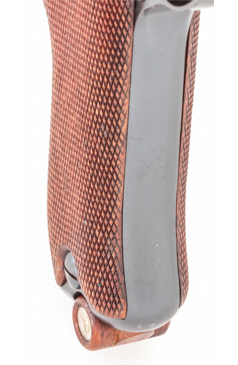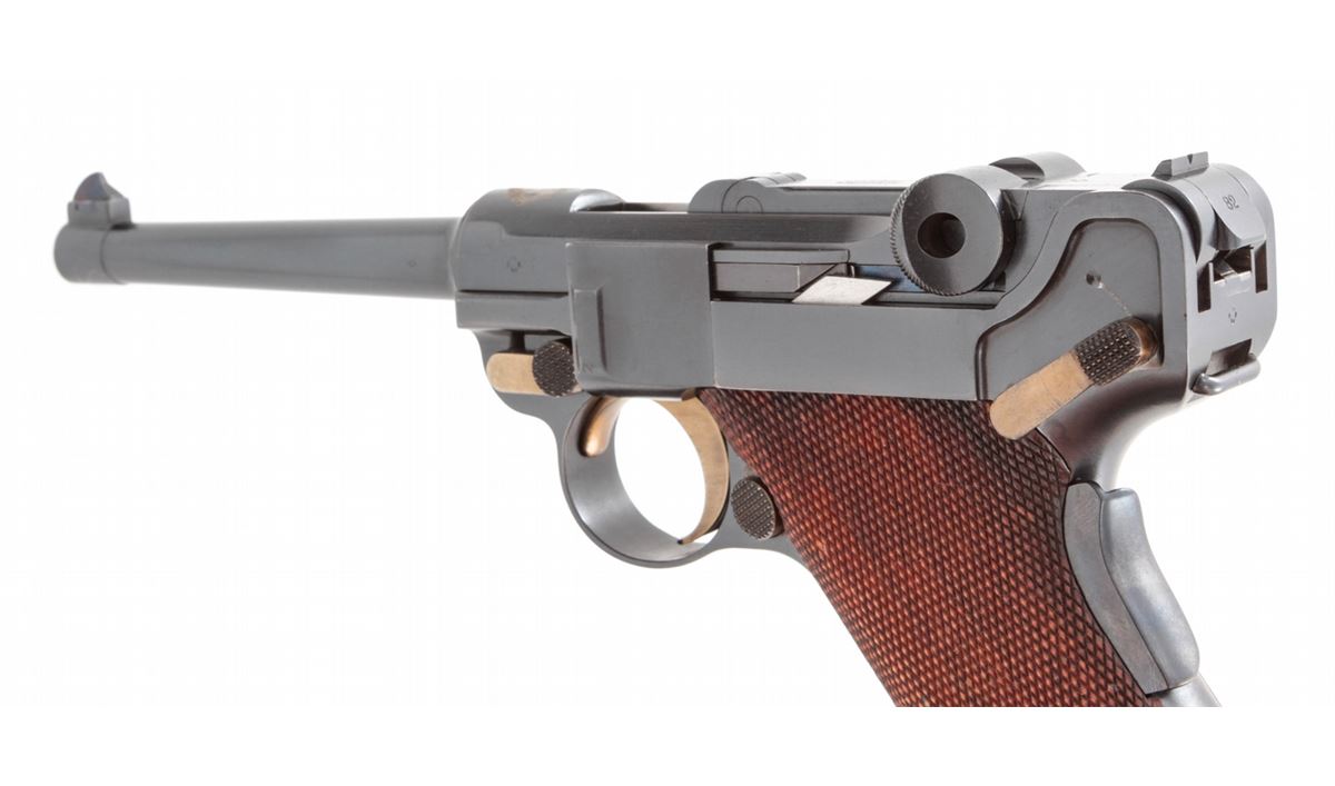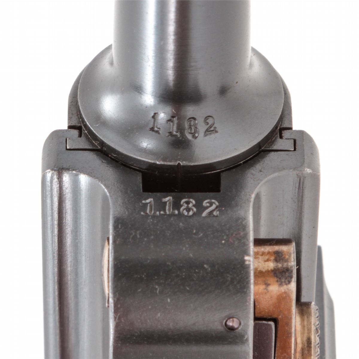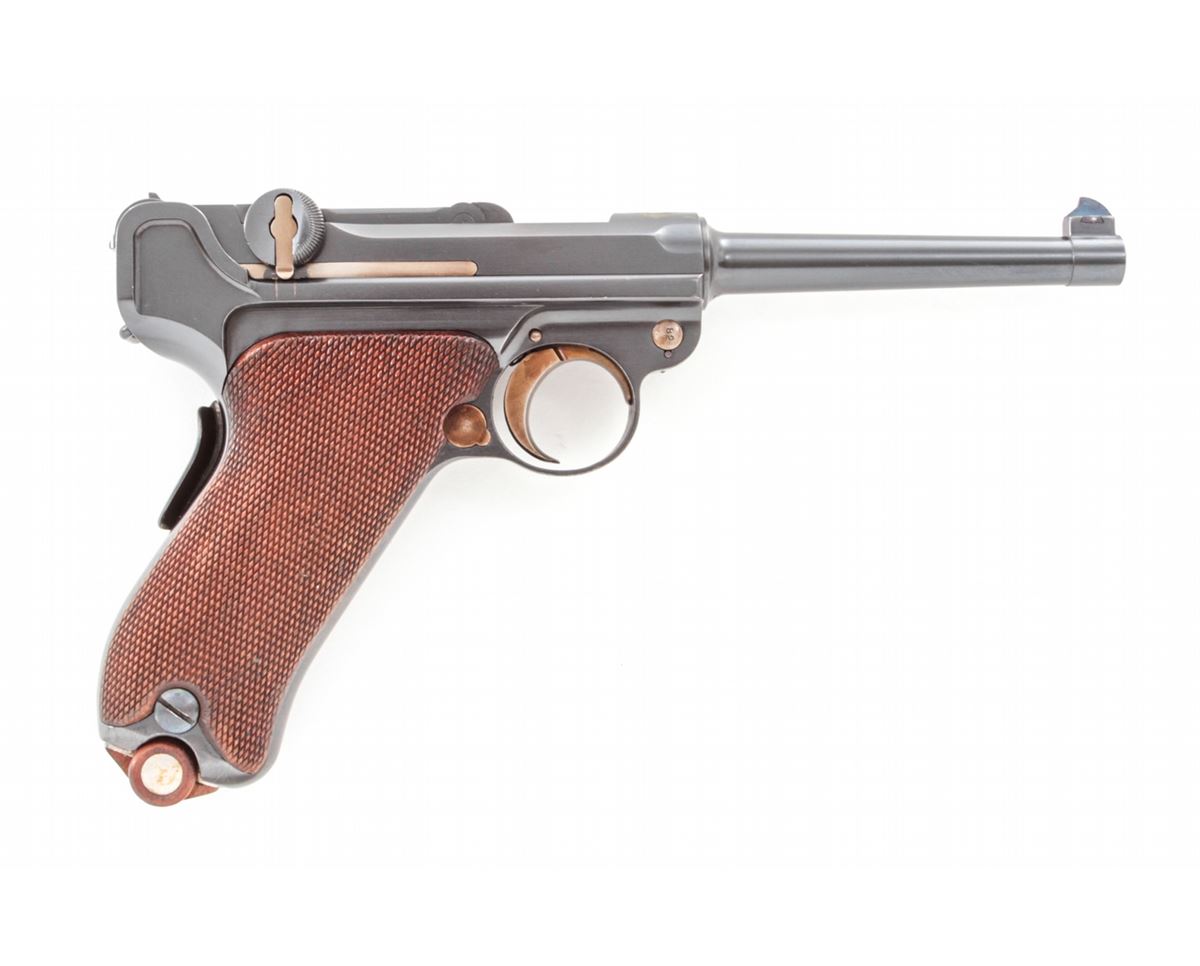 Early Model 1900 Swiss Commercial Luger, #1182, .30 Luger cal., 4-3/4'' barrel, blue finish with straw small parts, checkered walnut grips, with original nickel-plated magazine with walnut base having metal inserts to both sides. Early checkered thumb safety, lower portion of safety area polished bright, early dished toggle knobs, as well as grip safety. Chamber area marked with Swiss Cross in sunburst, DWM logo to central toggle link, both of which have been highlighted in gold. Condition is excellent showing light wear at muzzle, high forward edges of frame, and very light wear to sideplate. Front and backstrap show only light wear from handling. Grips show mild flattening and some oil darkening. Action is crisp, bore is mirror bright. Est.: $4,500-$6,000. (C&R/PPT)