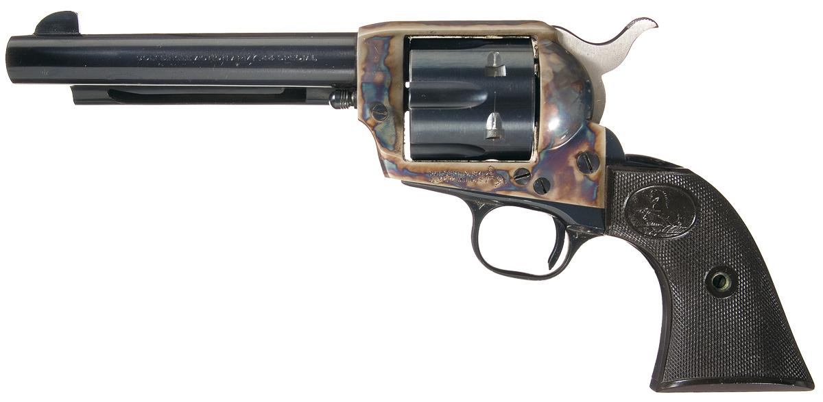 Manufactured in 1958, the second year of post war Single Action Army production. One line address on top of the barrel, the left side marked "COLT SINGLE ACTION ARMY .44 SPECIAL". The left side of the frame is marked with the two line, three patent date marking followed by the un-circled Rampant Colt. The left front of the trigger guard is marked with the Colt "VP" triangle proof, the rear is marked "J" and the right front is marked with a "5". The matching serial number is marked on the frame and under the grip on the left side of the front and backstraps. The frame is casehardened and remaining parts are blue with polished hammer sides. The revolver is fitted with black checkered two piece grips with the Rampant Colt in an oval at the tops.
