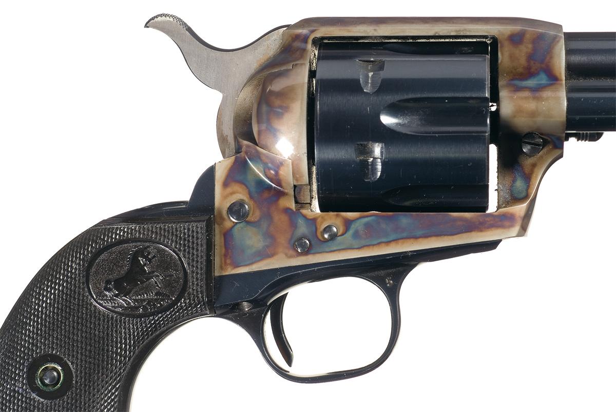 Condition: Excellent with exceptions noted below. The revolver retains 99% original blue finish with some very minor wear on the muzzle, a minor drag line on the cylinder and overall a few scattered minor dings and scratches. The frame retains all of the original bright case colors. The grips are excellent with light handling marks and sharp checkering. Missing ejector rod and spring. Mechanically needs work as the cylinder spins freely.