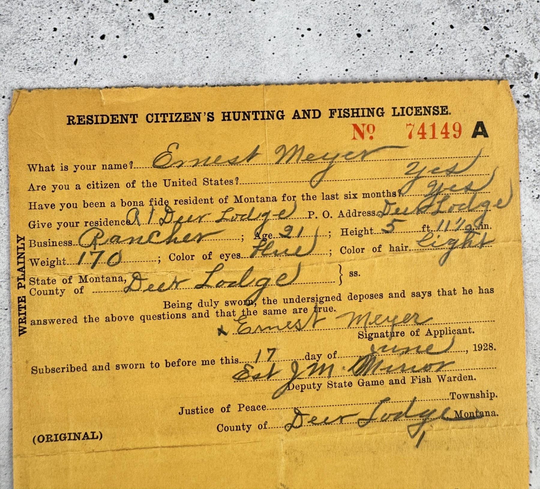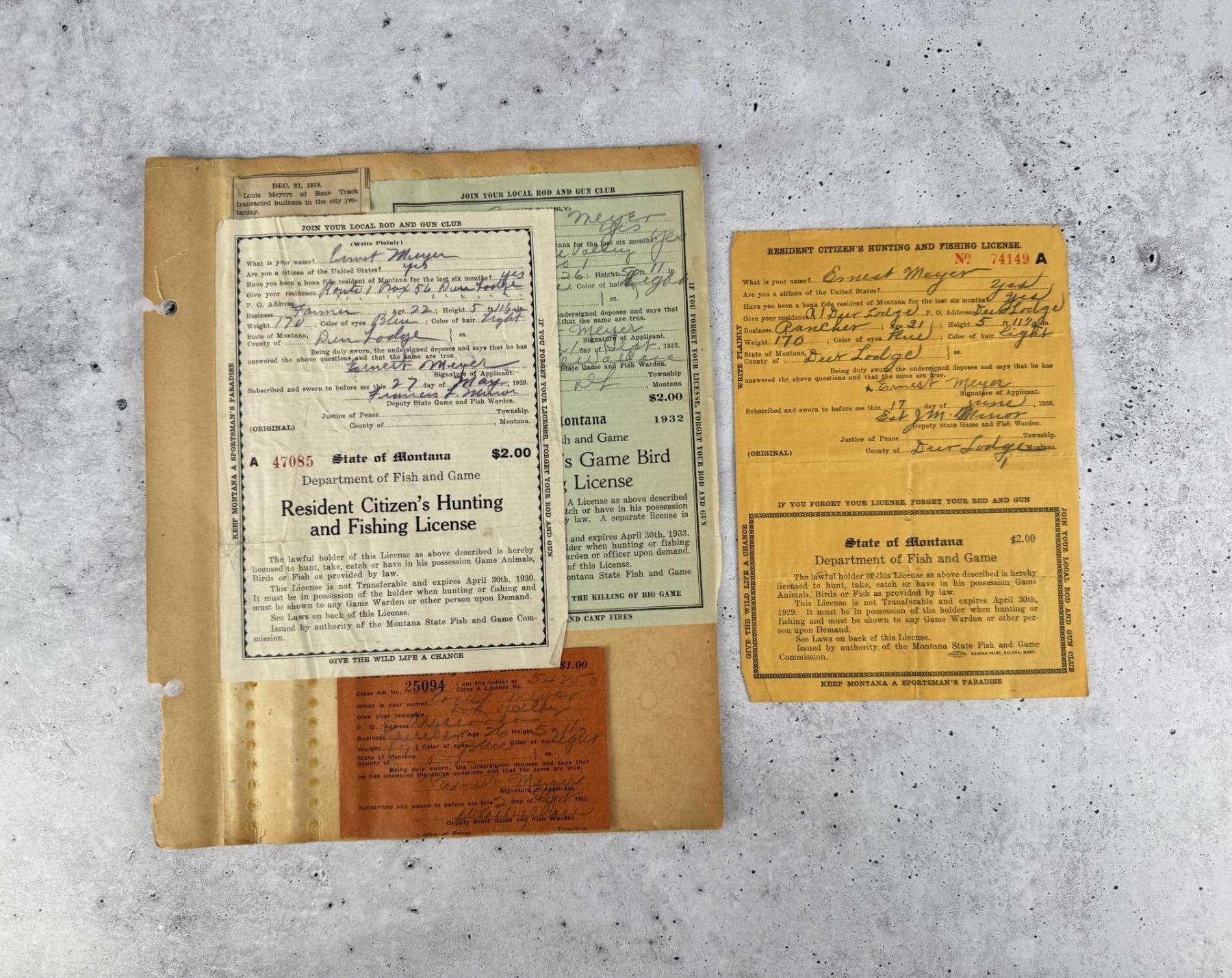 1928, 1929, 1930 hunting and fishing licences for Ernest Meyer Of Deer Lodge, Montana.