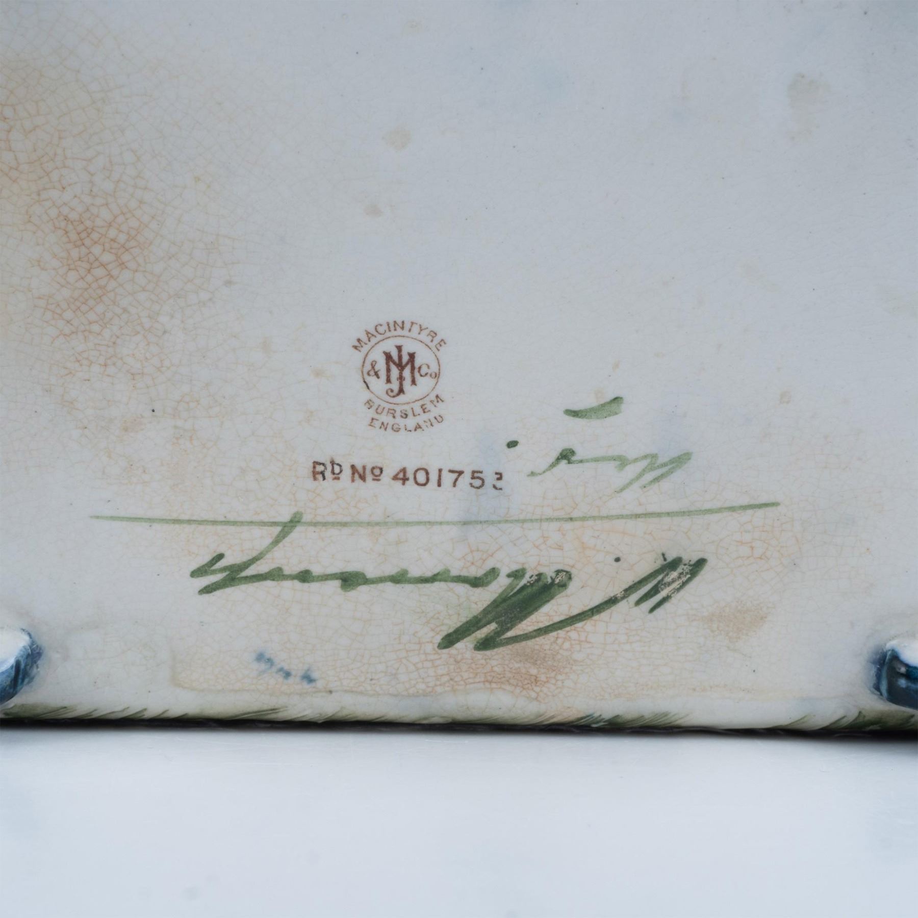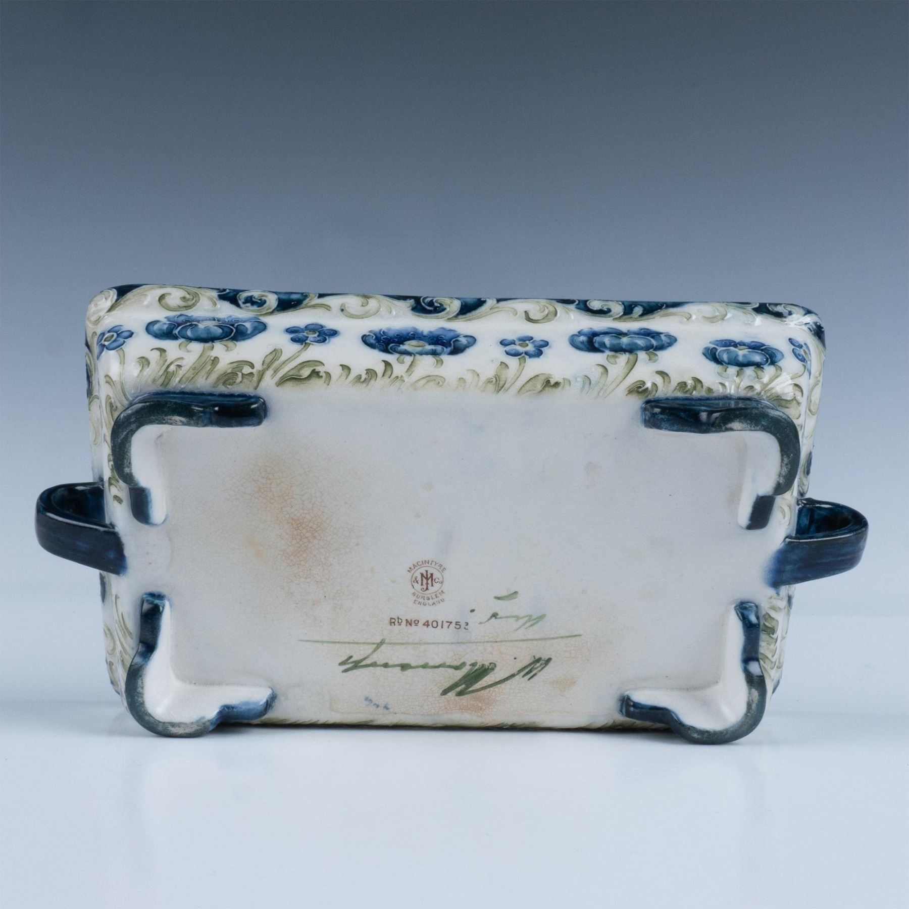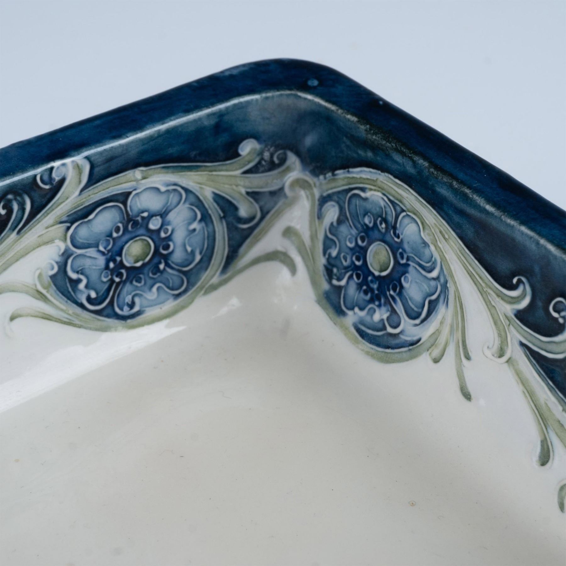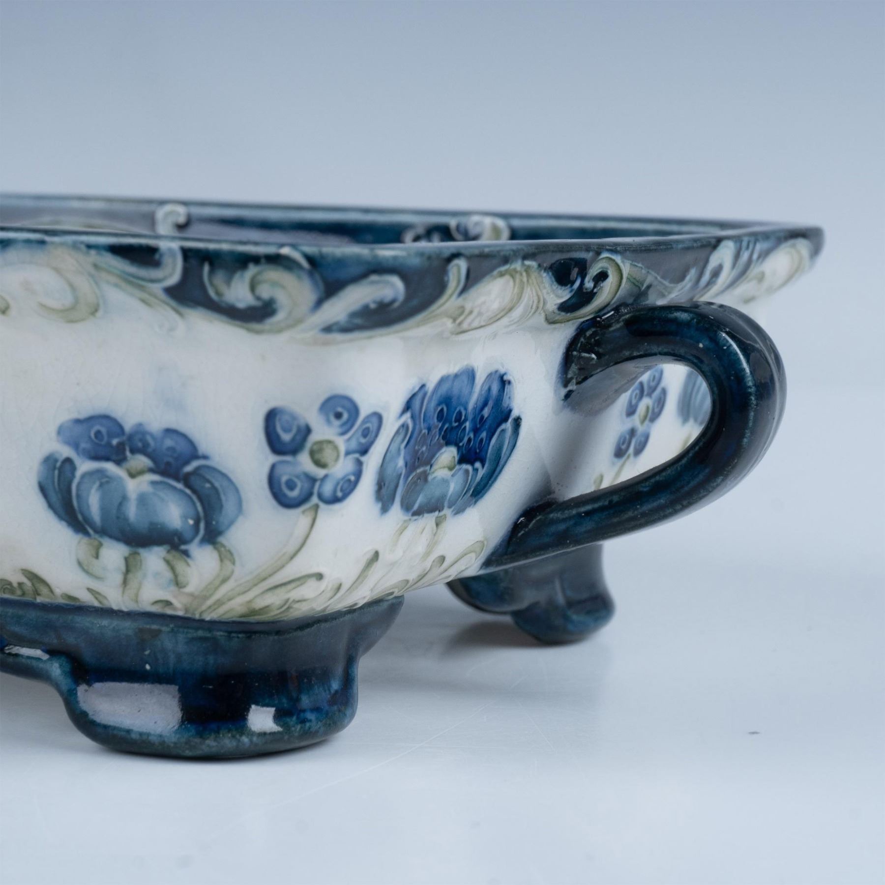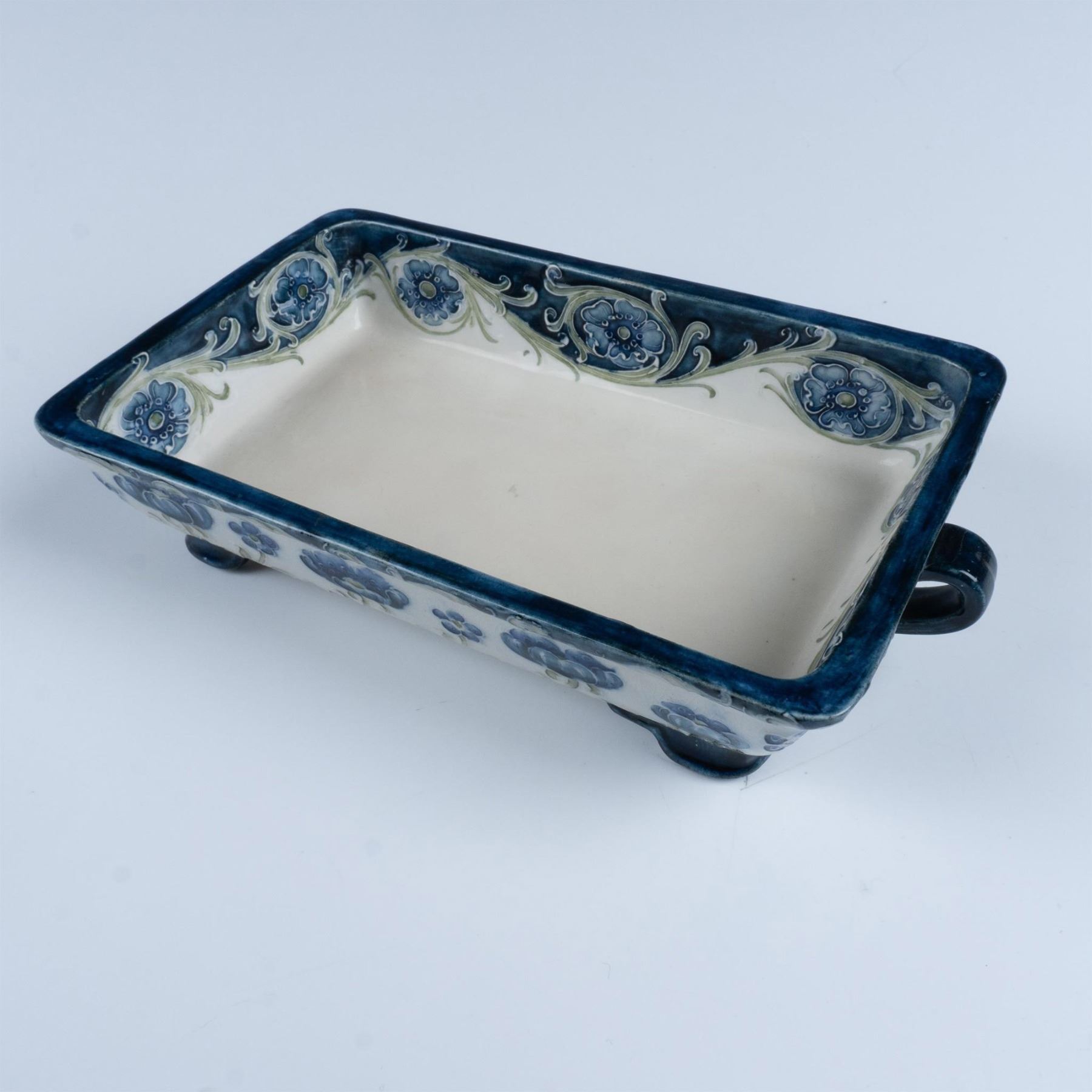 Small, rectangular footed bowl with double handles. In white and blue colored tones, and decorated in blue blossomed poppies. James Macintyre backstamp. William Moorcroft green signature.