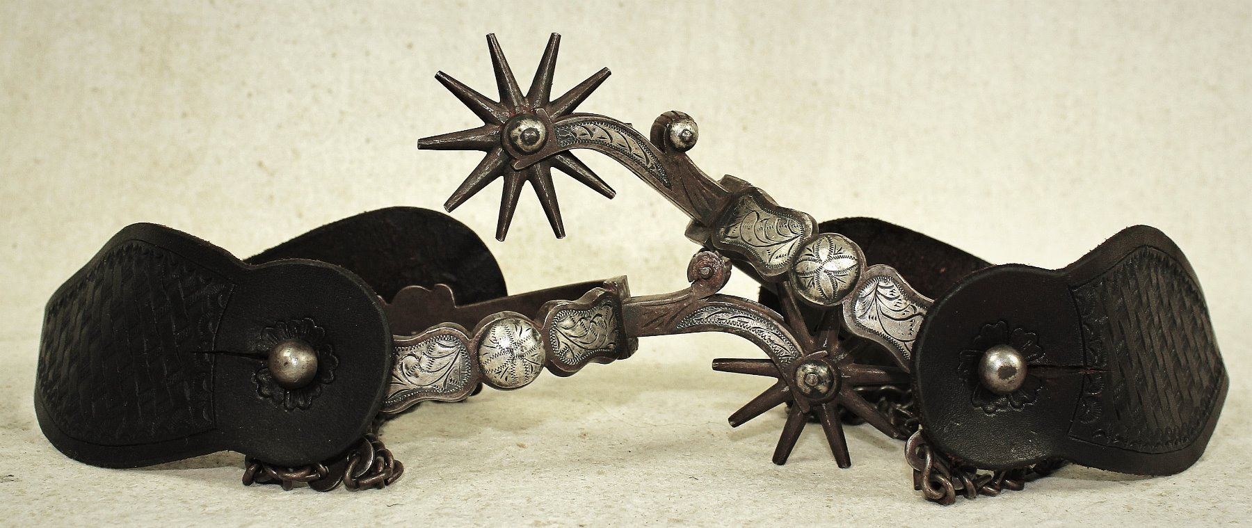 Wonderful, very early, single mounted California style spurs with detail engraved silver and iron offsides, and large multi-point rowels. Marked very well with squash "M"s, and showing traces of original blue finish and very little wear.