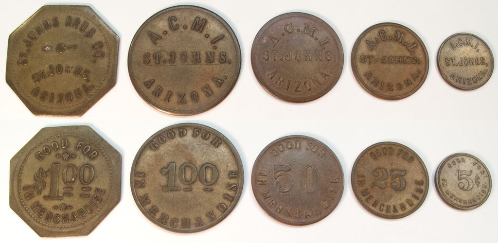 (5) A.C.M.I. // 5 & 25 & 50 & 1.00 Brass, St. JOHNS DRUG CO. // $1.00 Octagonal BrassCity: St. JohnsCounty: ApacheState: AZDate: