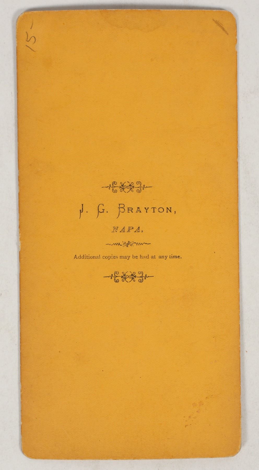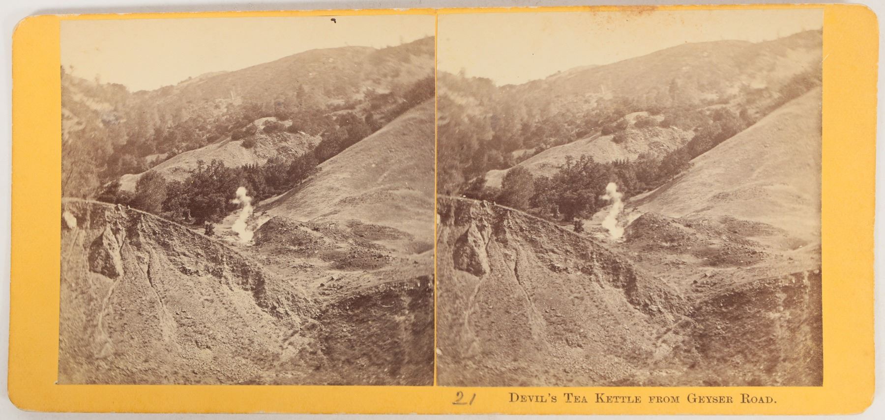 Rare. No. 21. Devil's Tea Kettle from Geyser Road. Photographer on reverse is JG Brayton, Napa. According to Mautz, he was active in Napa City on Main Street in 1867; on Second Street 1878-88. Our stereoview does not give a street address. Similar view to one from Carlton Watkins.