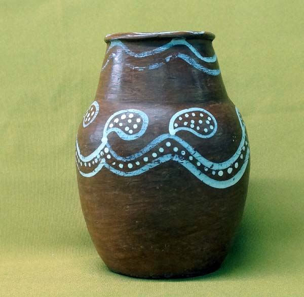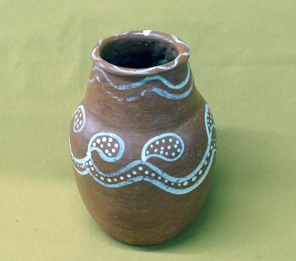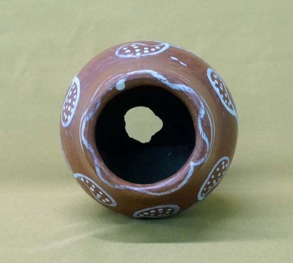 Early Native American Maricopa Pottery Jar, measures 6'' x 8'', has hole in bottom of jar