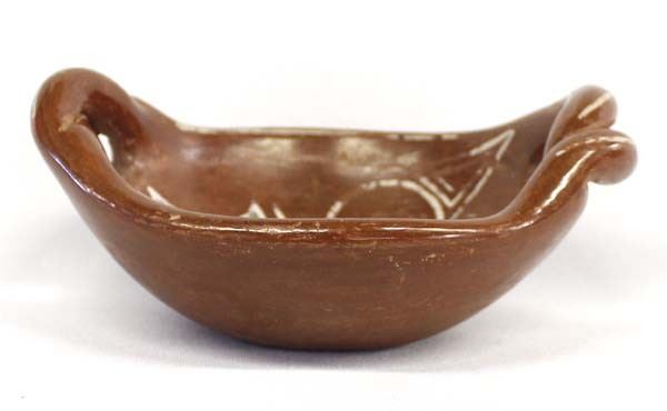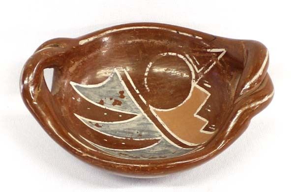 Early Native American Santa Clara Pottery Bowl, measures 2.5'' x 5.5'' x 4.5'', double handles, traditional painting on the inside, thick walled bowl