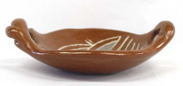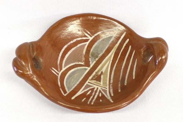 Early Native American Santa Clara Pottery Bowl, measures 7''L x 5.25''W x 2''H, double handles, traditional painting on the inside, thick walled bowl
