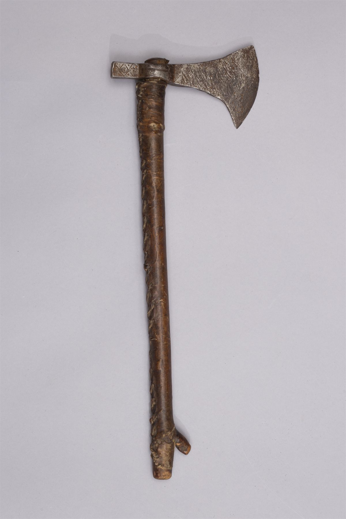 Early Forged axe head with solid wood haft wrapped in rawhide. Axe head has native markings.