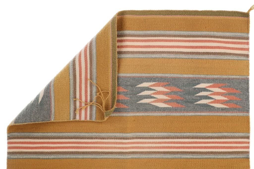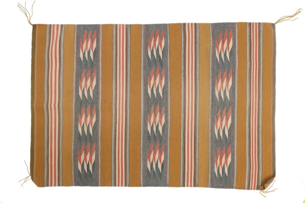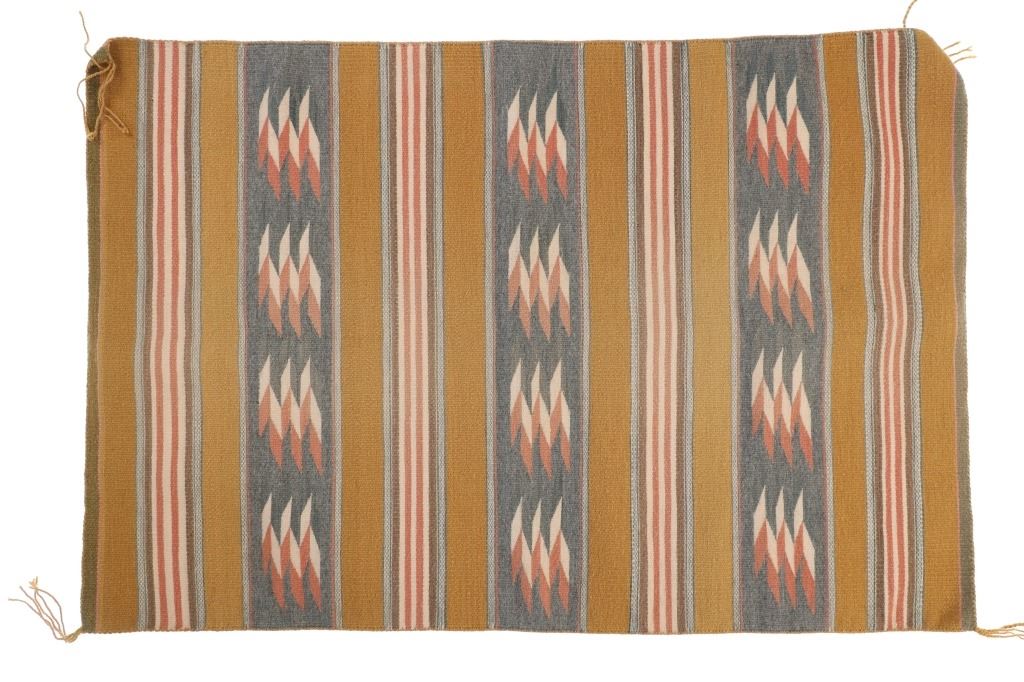 Featured in this lot is this Navajo Chinle Trading Post Pattern Wool Rug, circa early mid-century. The rug features a wonderfully and professionally crafted wool construction with bands of brown, cream, and rose between cream and grey strip bands. Stepped designs of rose and cream sit against a background of steel grey panels. Bands of mustard yellow flow horizontally. Borders have silver sage and pink as well as olive and pink. The Chinle style was developed by Mary Cabot Wheelwright and Cozy McSparron, a trader at Chinle. They sought to revive weaving using classic period designs with vegetal dyes. Chinle rugs are known for their striped bands of geometric patterns and contrasting colors. These new regional styles were all inspired by Navajo Transitional Period designs, which typically featured striped motifs and vegetal dyes. This rug is good overall condition, seams and tassels are tight and well secured. Measures 30.5"W x 45.5"L, weight is 2lb, 2oz.