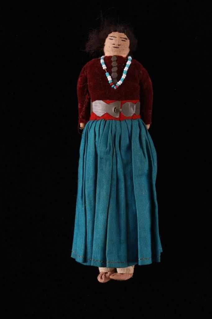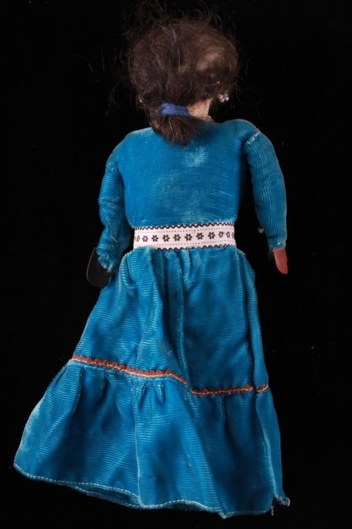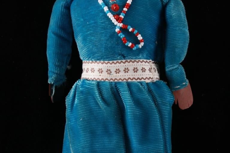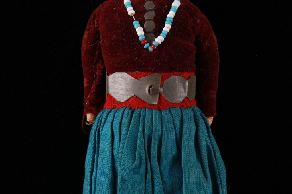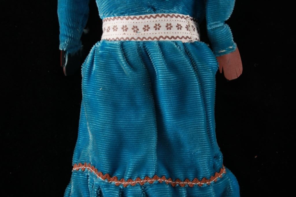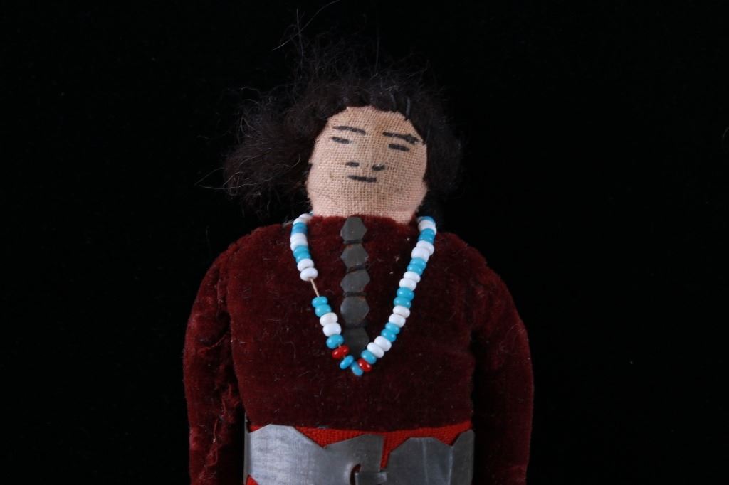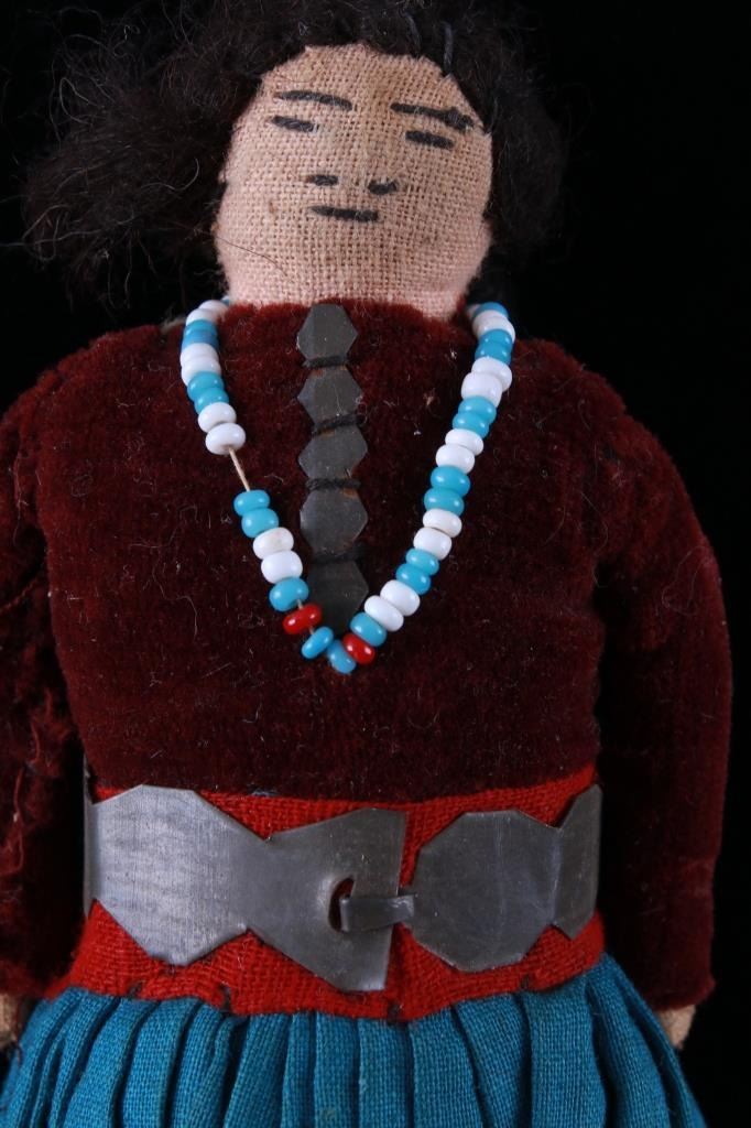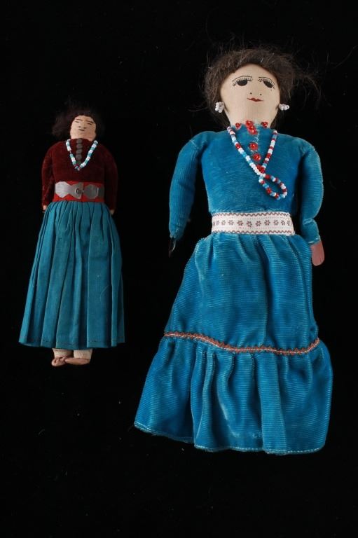 Featured in this lot is this early Navajo embroidered doll pair circa 1930's. There are two dolls in this collection. The first is the larger of the two with blue colored trade cloth dress with embroidered decoration and trade seed bead necklace with colors such as sky blue, medium red, and chalk white. The second is an smaller