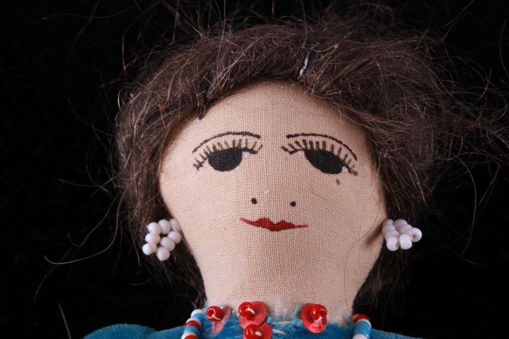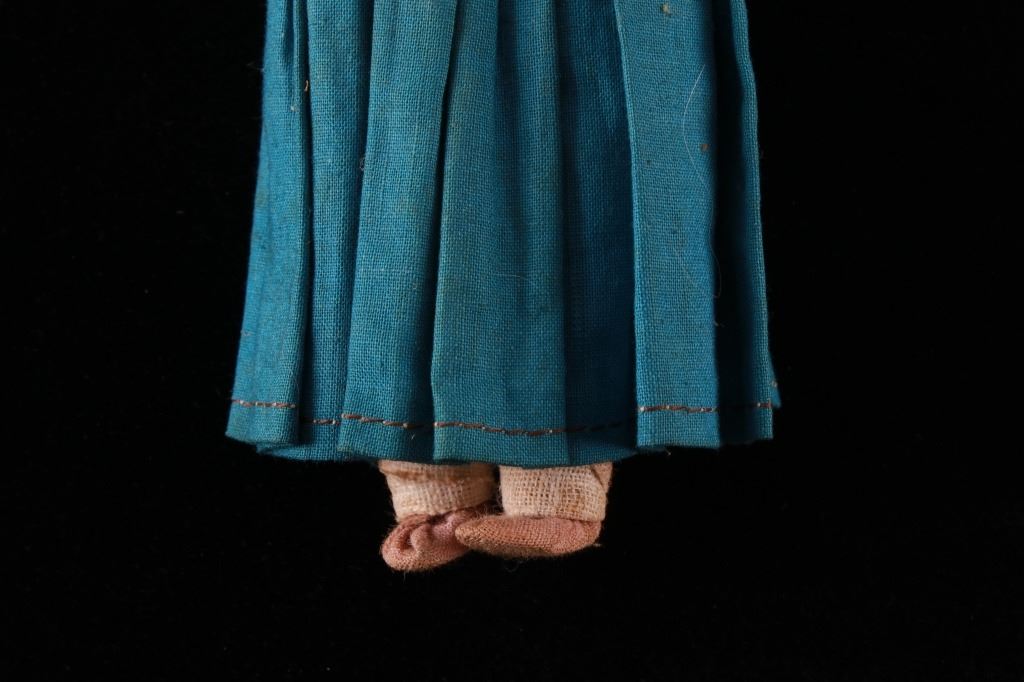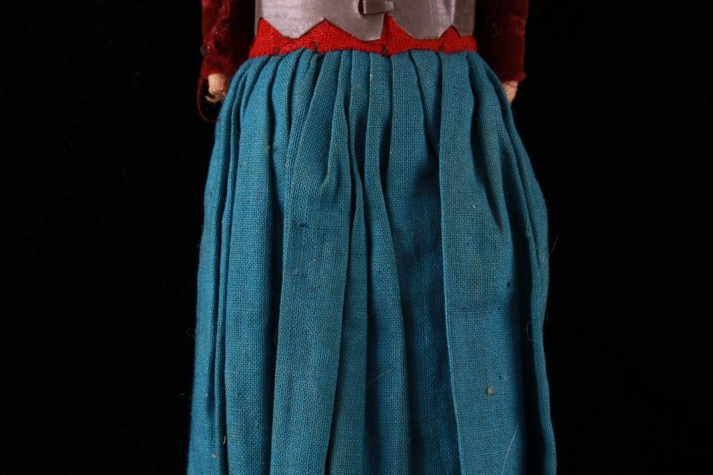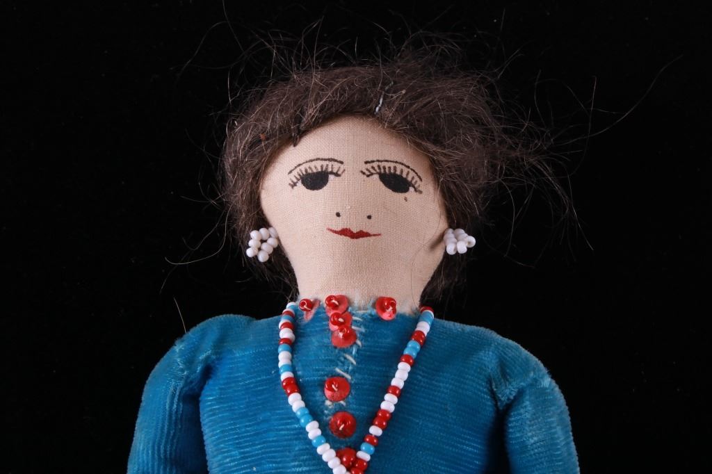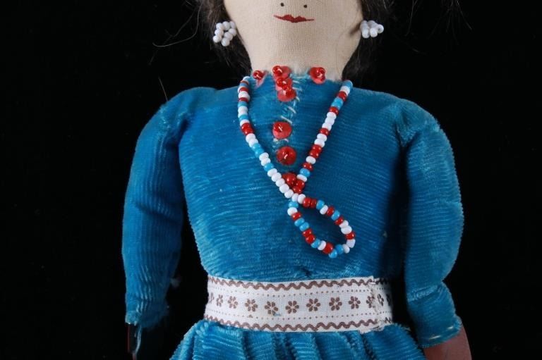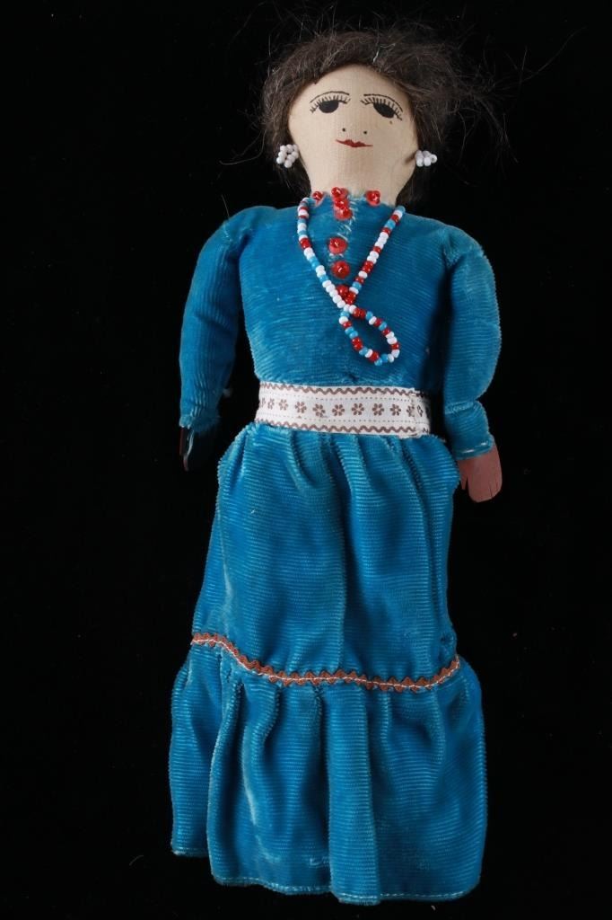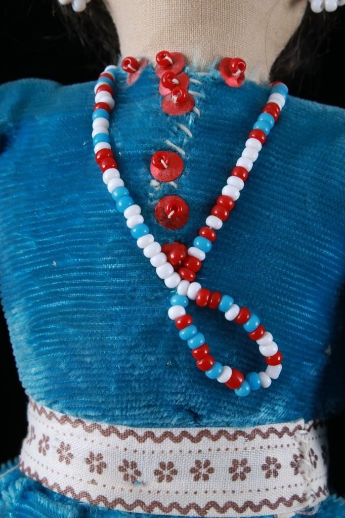 Featured in this lot is this early Navajo embroidered doll pair circa 1930's. There are two dolls in this collection. The first is the larger of the two with blue colored trade cloth dress with embroidered decoration and trade seed bead necklace with colors such as sky blue, medium red, and chalk white. The second is an smaller