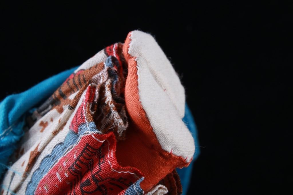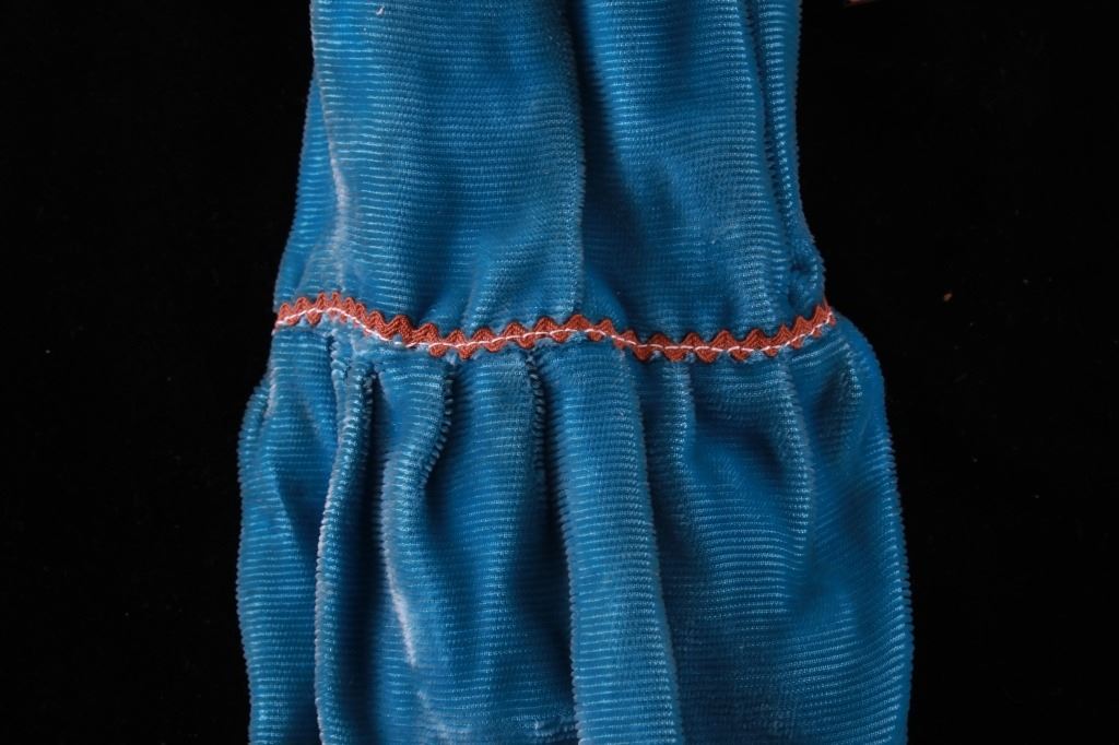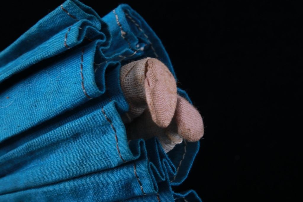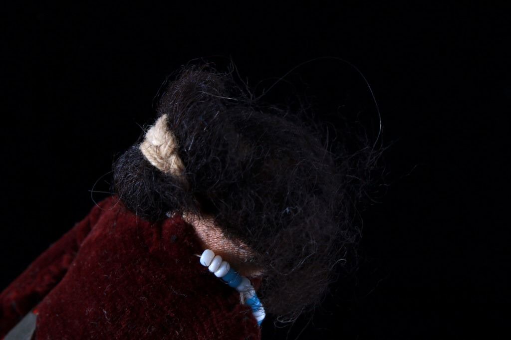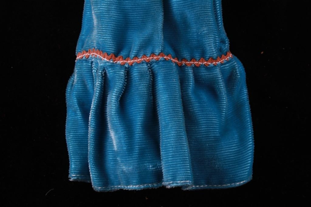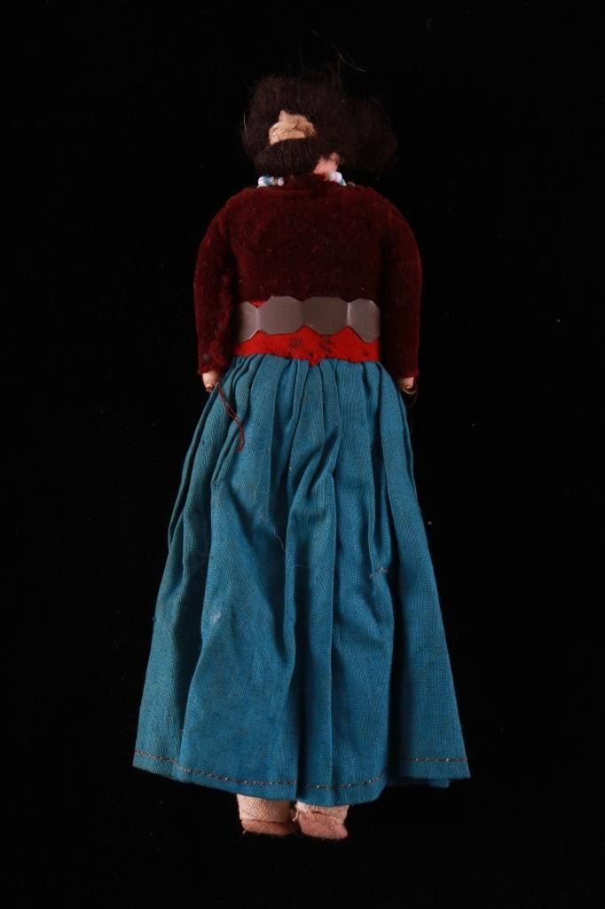 Featured in this lot is this early Navajo embroidered doll pair circa 1930's. There are two dolls in this collection. The first is the larger of the two with blue colored trade cloth dress with embroidered decoration and trade seed bead necklace with colors such as sky blue, medium red, and chalk white. The second is an smaller